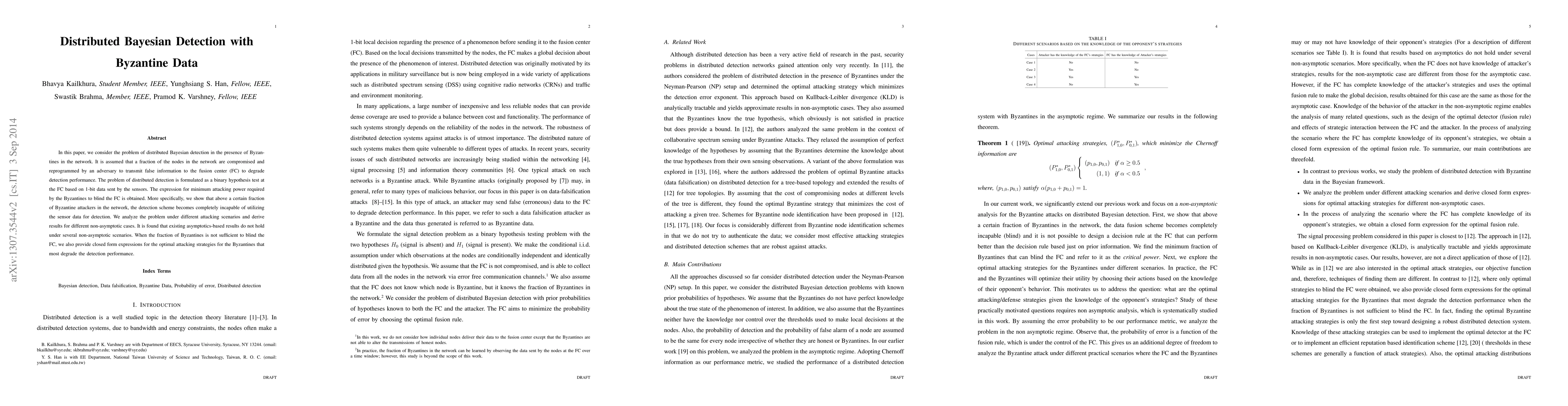 This paper explores distributed Bayesian detection in networks with Byzantine nodes that transmit false data to degrade performance. It derives the minimum attacking power required for Byzantines to blind the fusion center and shows that detection becomes ineffective above a certain attacker fraction, with results differing from asymptotics-based approaches.