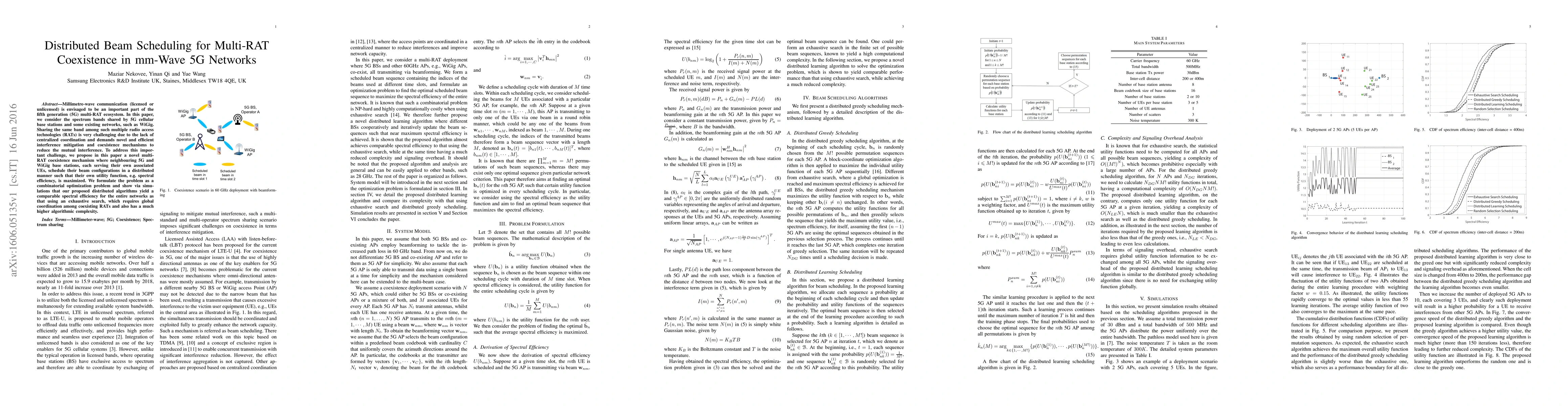 This paper proposes a distributed beam scheduling mechanism for multi-RAT coexistence in mm-Wave 5G networks, aiming to mitigate interference between 5G cellular and WiGig networks. The proposed distributed algorithms achieve comparable spectral efficiency to exhaustive search methods, which require centralized coordination.