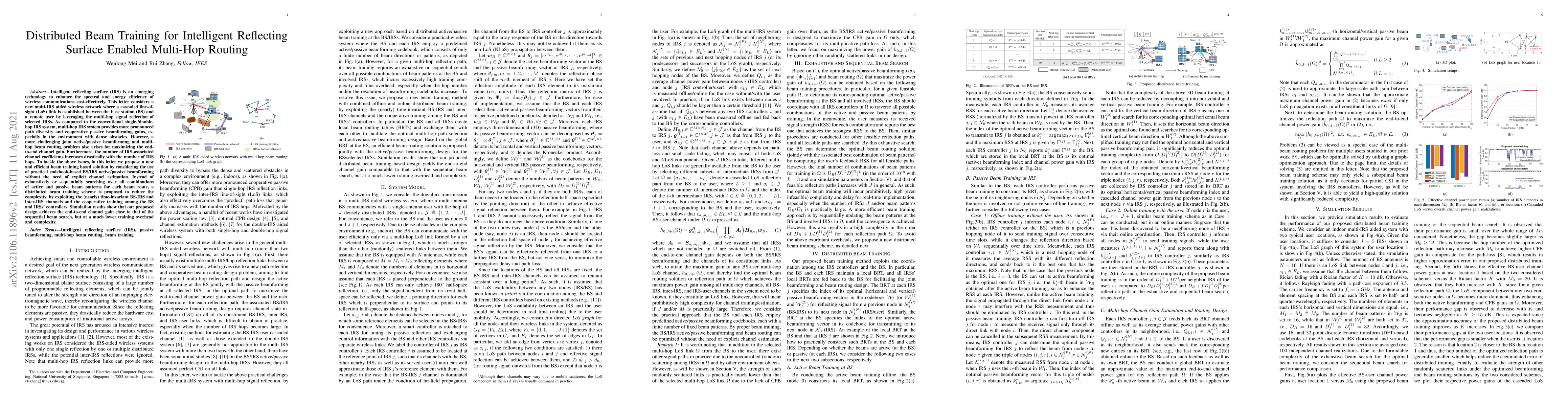 This paper proposes a distributed beam training method for multi-hop routing in intelligent reflecting surface (IRS) enabled networks to enhance spectral and energy efficiency. The approach leverages cooperative training among base stations and IRS controllers to reduce complexity and training overhead, achieving near-optimal end-to-end channel gain with significantly lower computational cost compared to exhaustive search methods.