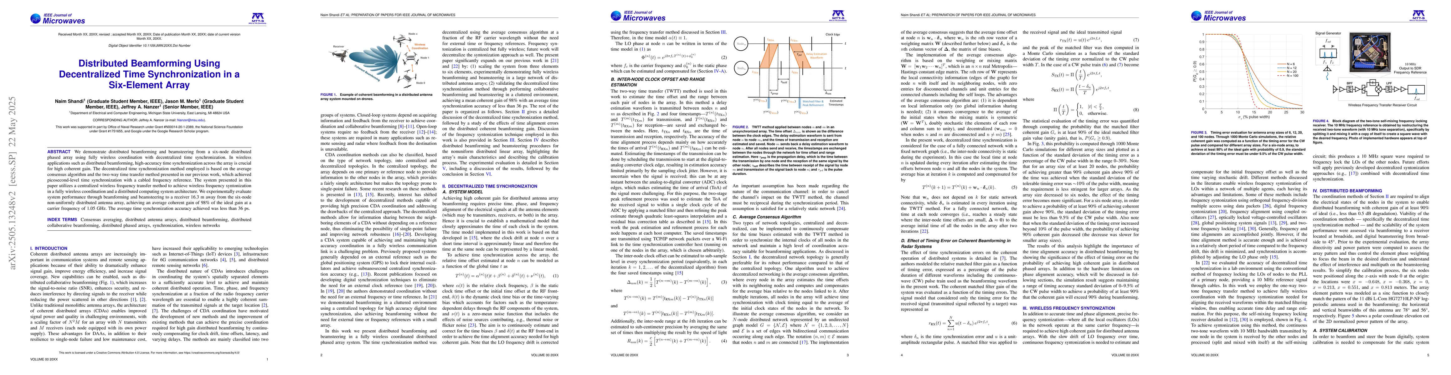 Researchers developed a distributed beamforming system using decentralized time synchronization for a six-element array, achieving 98% of ideal gain with sub-36ps time sync accuracy.
