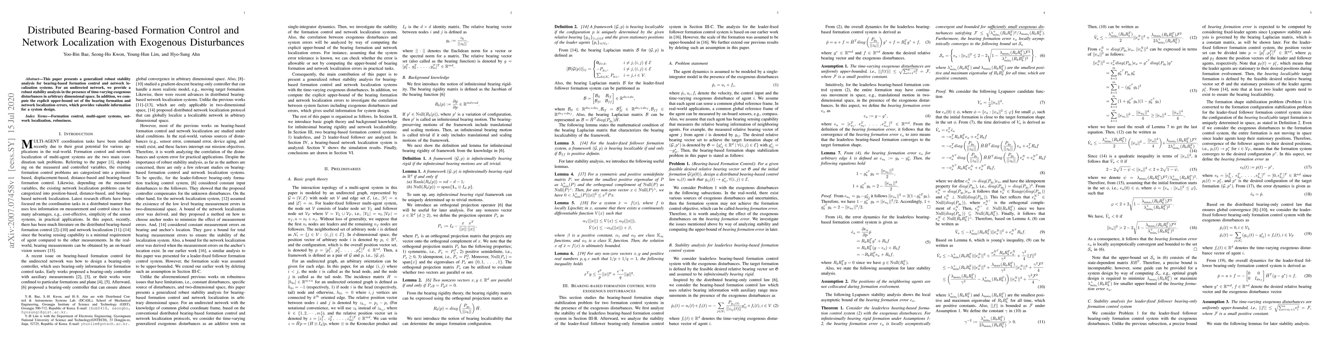 This paper presents a robust stability analysis for bearing-based formation control and network localization under time-varying exogenous disturbances. It computes an explicit upper-bound for errors, aiding system design.