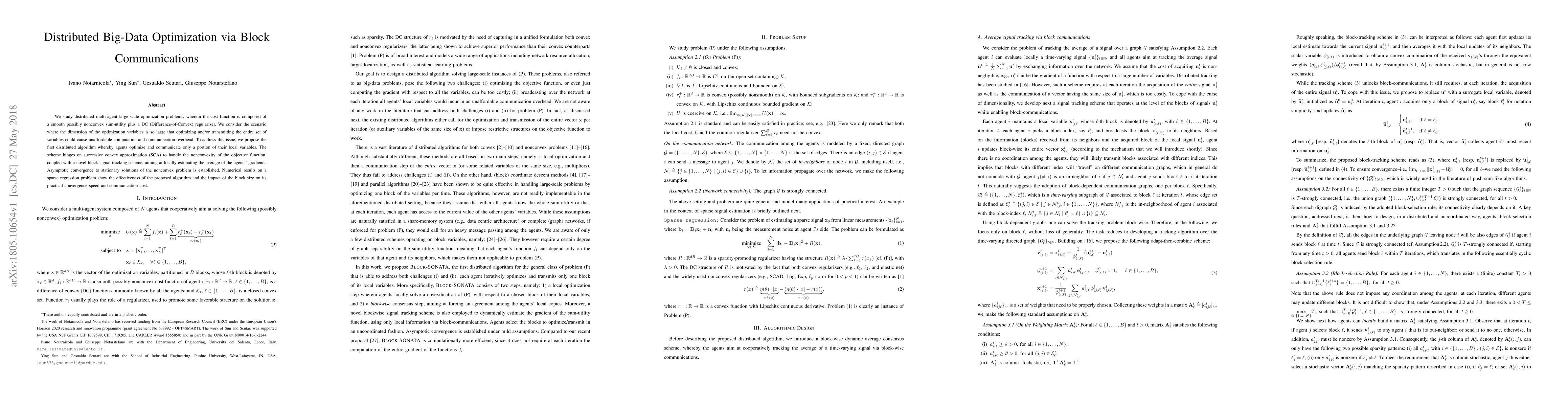 We study distributed multi-agent large-scale optimization problems, wherein the cost function is composed of a smooth possibly nonconvex sum-utility plus a DC (Difference-of-Convex) regularizer. We consider the scenario where the dimension of the optimization variables is so large that optimizing and/or transmitting the entire set of variables could cause unaffordable computation and communication overhead. To address this issue, we propose the first distributed algorithm whereby agents optimize and communicate only a portion of their local variables. The scheme hinges on successive convex approximation (SCA) to handle the nonconvexity of the objective function, coupled with a novel block-signal tracking scheme, aiming at locally estimating the average of the agents' gradients. Asymptotic convergence to stationary solutions of the nonconvex problem is established. Numerical results on a sparse regression problem show the effectiveness of the proposed algorithm and the impact of the block size on its practical convergence speed and communication cost.