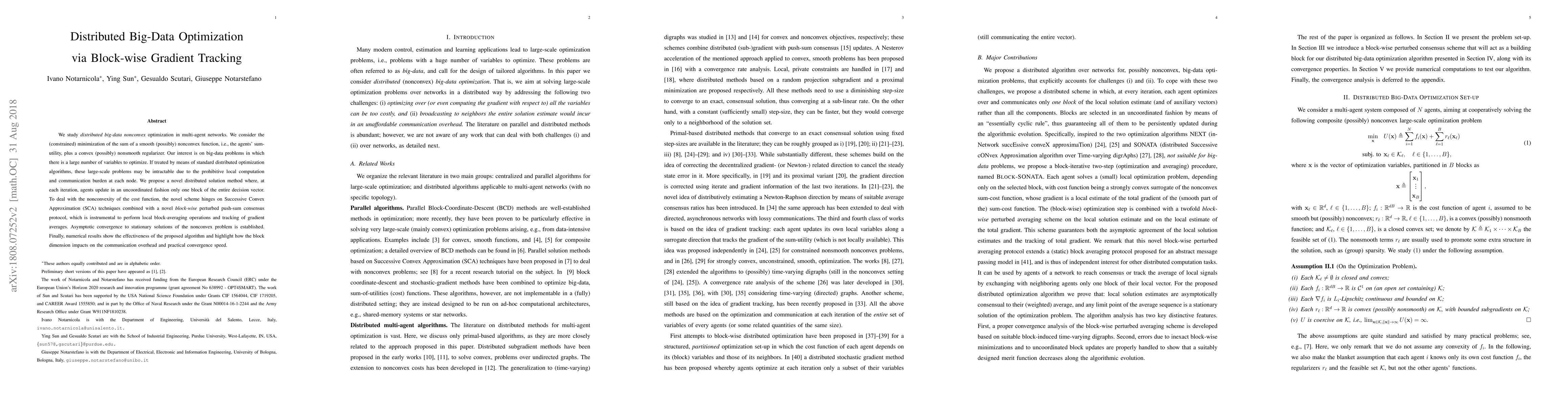 This paper proposes a novel distributed optimization method for large-scale big-data nonconvex problems in multi-agent networks, utilizing block-wise gradient tracking and Successive Convex Approximation to achieve asymptotic convergence. The method reduces computation and communication burdens by updating only one block of variables per iteration, demonstrating effective convergence and performance through numerical results.