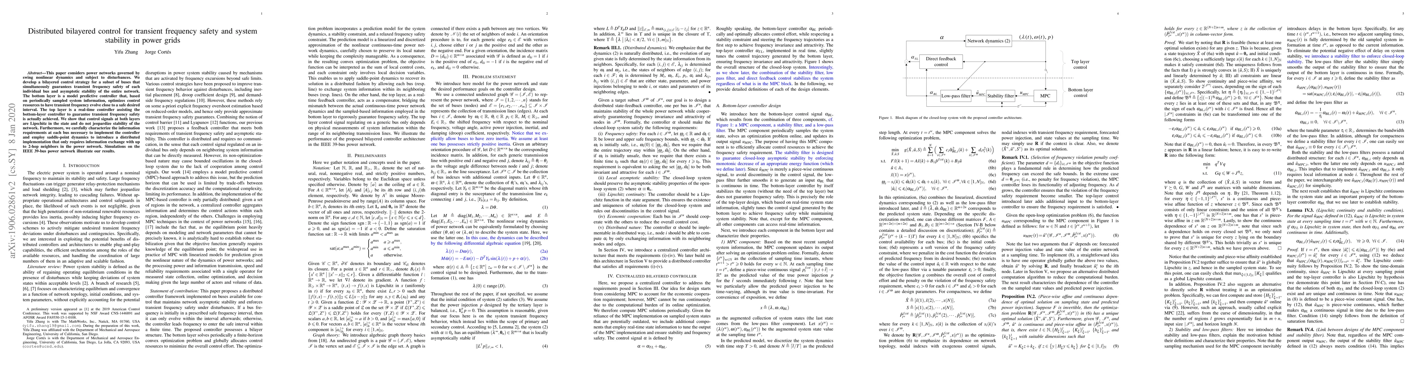 This paper considers power networks governed by swing nonlinear dynamics and subject to disturbances. We develop a bilayered control strategy for a subset of buses that simultaneously guarantees transient frequency safety of each individual bus and asymptotic stability of the entire network. The bottom layer is a model predictive controller that, based on periodically sampled system information, optimizes control resources to have transient frequency evolve close to a safe desired interval. The top layer is a real-time controller assisting the bottom-layer controller to guarantee transient frequency safety is actually achieved. We show that control signals at both layers are Lipschitz in the state and do not jeopardize stability of the network. Furthermore, we carefully characterize the information requirements at each bus necessary to implement the controller and employ saddle-point dynamics to introduce a distributed implementation that only requires information exchange with up to 2-hop neighbors in the power network. Simulations on the IEEE 39-bus power network illustrate our results.