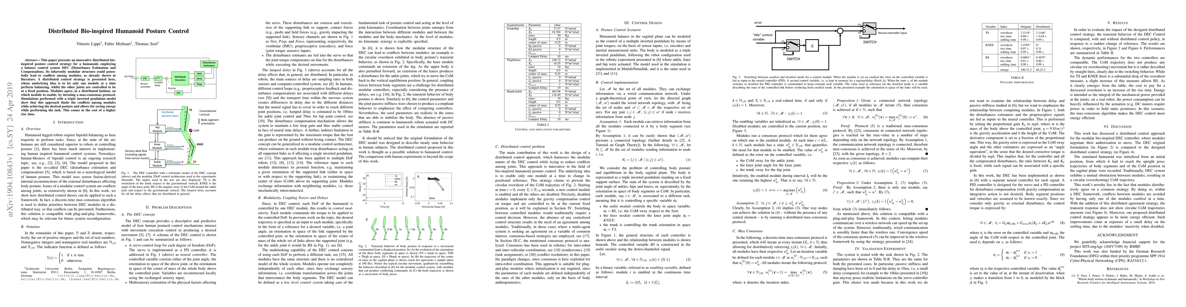This paper introduces a distributed bio-inspired posture control strategy for humanoid robots using a DEC system, minimizing module conflicts via a max-consensus protocol. Simulation results with a triple inverted pendulum model indicate improved energy efficiency and posture control despite a longer rise time.