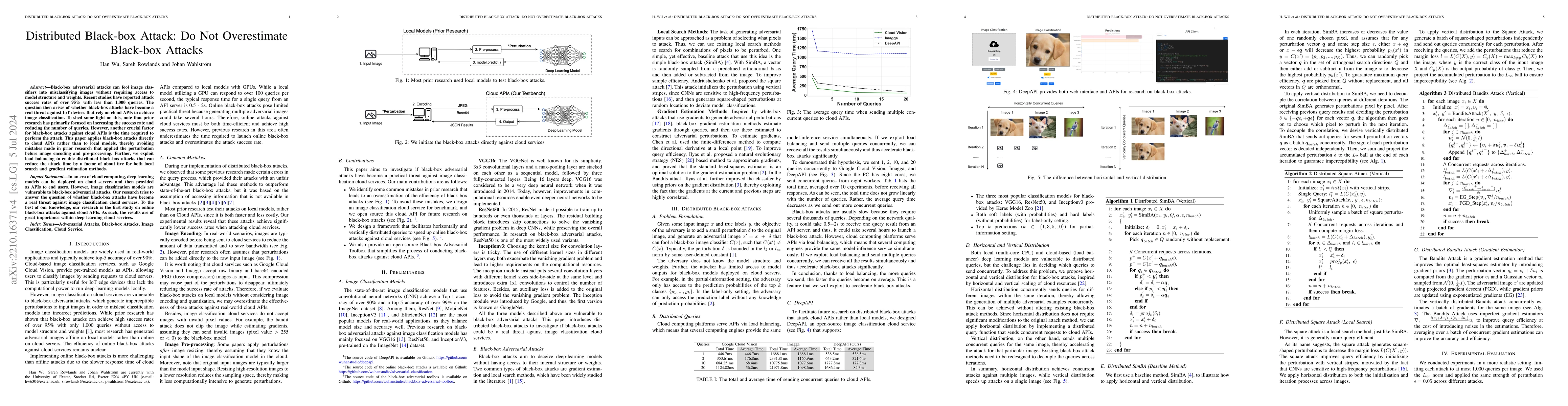 Black-box adversarial attacks can fool image classifiers into misclassifying images without requiring access to model structure and weights. Recent studies have reported attack success rates of over 95% with less than 1,000 queries. The question then arises of whether black-box attacks have become a real threat against IoT devices that rely on cloud APIs to achieve image classification. To shed some light on this, note that prior research has primarily focused on increasing the success rate and reducing the number of queries. However, another crucial factor for black-box attacks against cloud APIs is the time required to perform the attack. This paper applies black-box attacks directly to cloud APIs rather than to local models, thereby avoiding mistakes made in prior research that applied the perturbation before image encoding and pre-processing. Further, we exploit load balancing to enable distributed black-box attacks that can reduce the attack time by a factor of about five for both local search and gradient estimation methods.