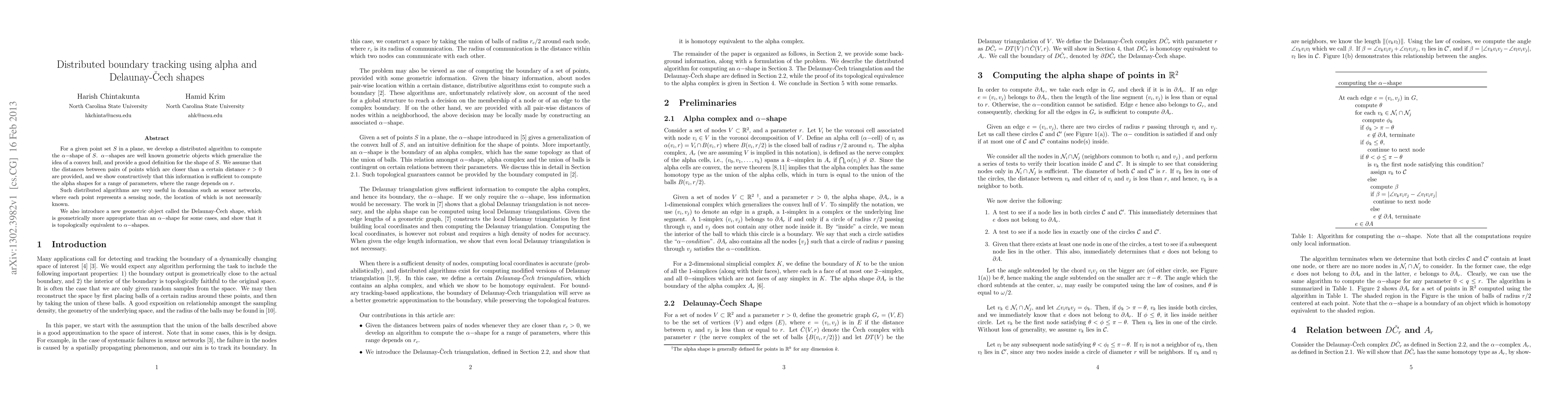 This paper presents a distributed algorithm for computing $\alpha$-shapes from a given point set, leveraging distance information for nodes closer than a threshold. It also introduces the Delaunay-\v{C}ech shape, demonstrating its topological equivalence to $\alpha$-shapes and its suitability for certain applications.