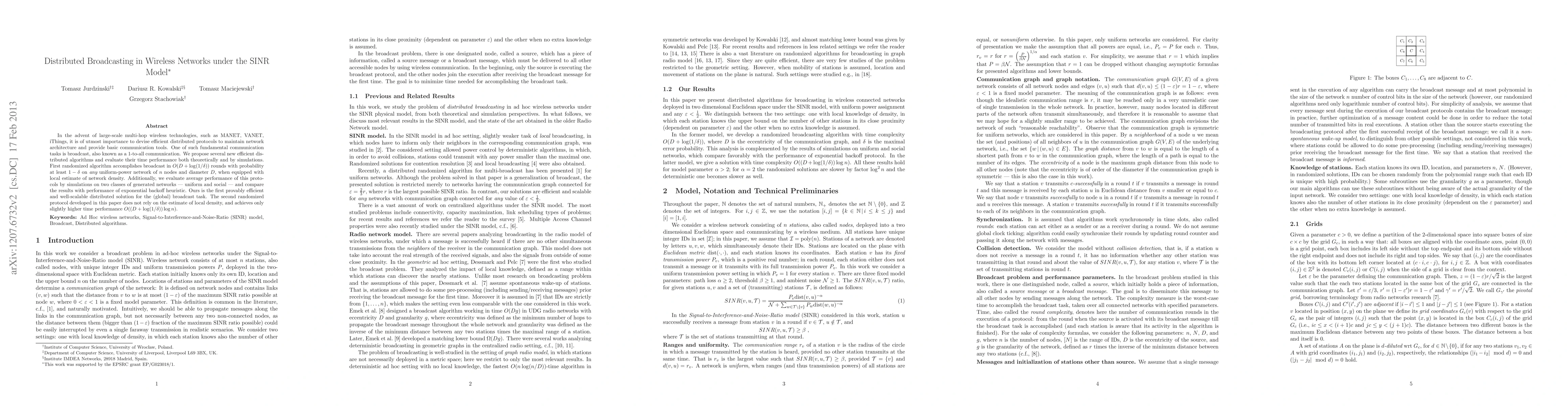 In the advent of large-scale multi-hop wireless technologies, such as MANET, VANET, iThings, it is of utmost importance to devise efficient distributed protocols to maintain network architecture and provide basic communication tools. One of such fundamental communication tasks is broadcast, also known as a 1-to-all communication. We propose several new efficient distributed algorithms and evaluate their time performance both theoretically and by simulations. First randomized algorithm accomplishes broadcast in O(D+log(1/d)) rounds with probability at least 1-d on any uniform-power network of n nodes and diameter D, when equipped with local estimate of network density. Additionally, we evaluate average performance of this protocols by simulations on two classes of generated networks - uniform and social - and compare the results with performance of exponential backoff heuristic. Ours is the first provably efficient and well-scalable distributed solution for the (global) broadcast task. The second randomized protocol developed in this paper does not rely on the estimate of local density, and achieves only slightly higher time performance O((D+log(1/d))log n). Finally, we provide a deterministic algorithm achieving similar time O(D log^2 n), supported by theoretical analysis.