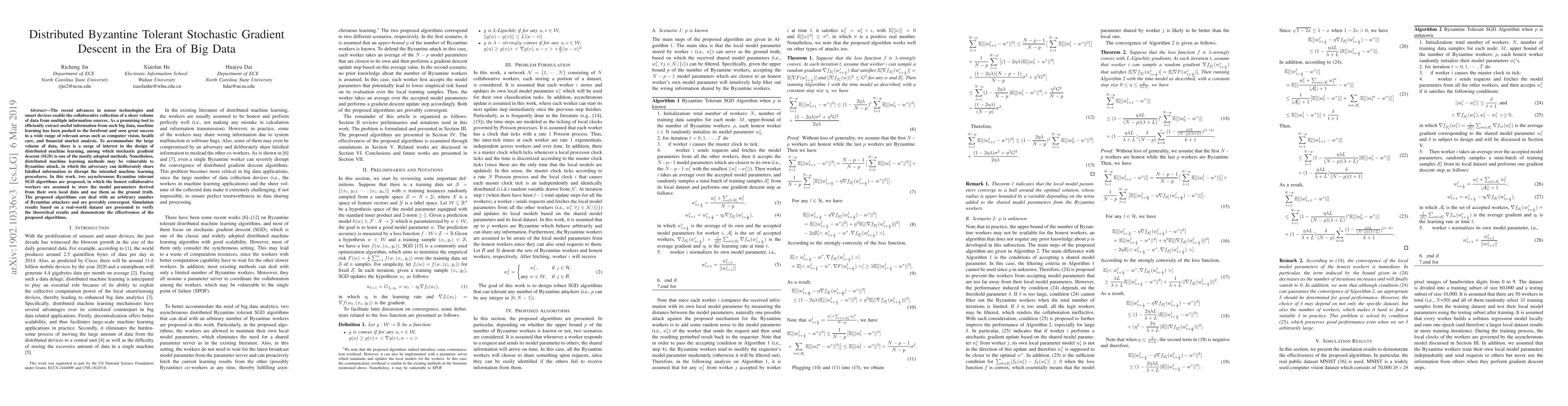 The paper proposes two asynchronous Byzantine tolerant SGD algorithms for distributed machine learning, where honest workers store local model parameters as ground truth and filter out Byzantine workers' falsified information.