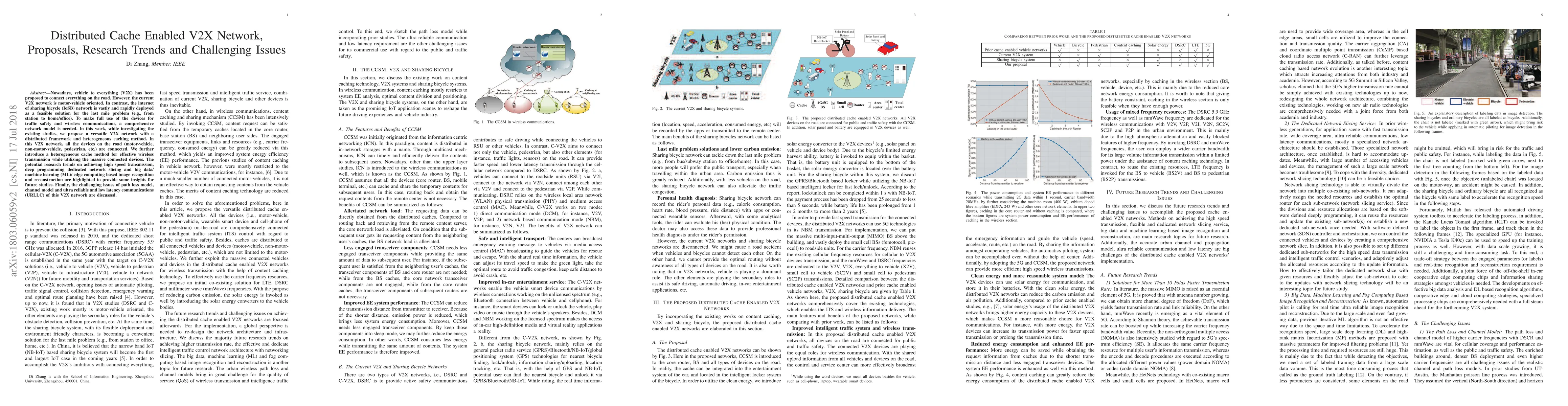 Nowadays, the internet of vehicles (IoV) has been evolved into the stage of vehicle to everything (V2X). However, the majority of existing work focuses on the motor-vehicles. In contrast, the sharing bicycle system is vastly and rapidly deployed as a feasible internet of things (IoT) application scene for the last mile problem (e.g., from station to home/office). Moreover, the internet access of current V2X is relied on the back-haul to roadside unit (RSU) connections. In this paper, other than prior work, we propose a versatile V2X system with a distributed framework and heterogeneous caching method. All the vehicles and devices on-the-road (motor-vehicle, non-motor-vehicle, pedestrian, etc.) are comprehensively included in the proposed networks. We further introduce a heterogeneous cache method for effective wireless transmission while utilizing the massive connected devices. The potential research trends on achieving high speed transmission, deep programming dedicated network slicing are highlighted as well as the big data, machine learning (ML), fog computing based image recognition and reconstruction, to provide some insights for future studies. Finally, the challenging issues, i.e., urban street canyon path loss and channel models, ultra reliable communication and low latency requirements, are discussed.
