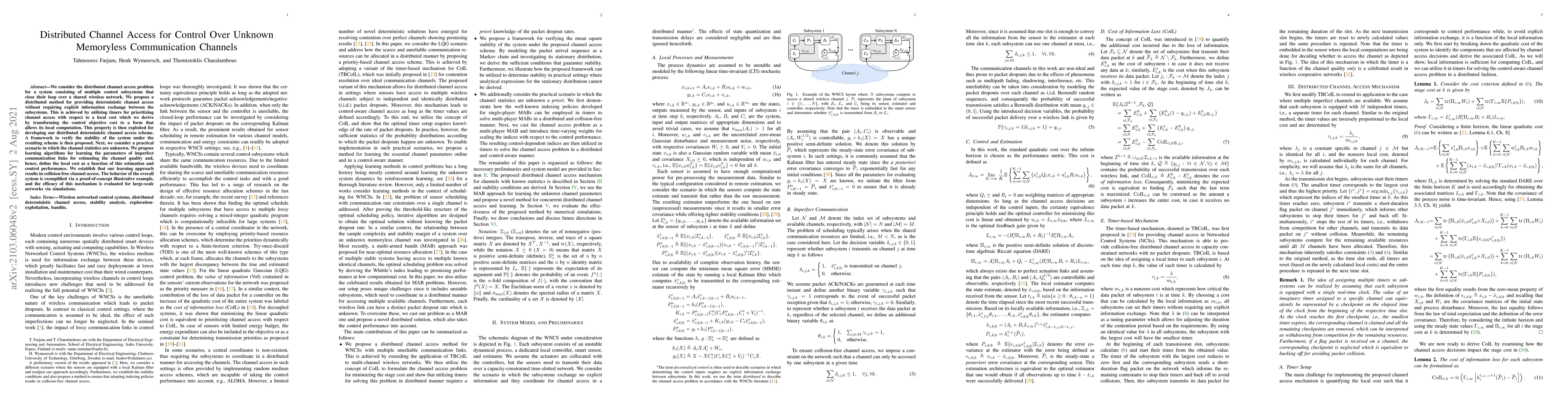 We consider the distributed channel access problem for a system consisting of multiple control subsystems that close their loop over a shared wireless network. We propose a distributed method for providing deterministic channel access without requiring explicit information exchange between the subsystems. This is achieved by utilizing timers for prioritizing channel access with respect to a local cost which we derive by transforming the control objective cost to a form that allows its local computation. This property is then exploited for developing our distributed deterministic channel access scheme. A framework to verify the stability of the system under the resulting scheme is then proposed. Next, we consider a practical scenario in which the channel statistics are unknown. We propose learning algorithms for learning the parameters of imperfect communication links for estimating the channel quality and, hence, define the local cost as a function of this estimation and control performance. We establish that our learning approach results in collision-free channel access. The behavior of the overall system is exemplified via a proof-of-concept illustrative example, and the efficacy of this mechanism is evaluated for large-scale networks via simulations.