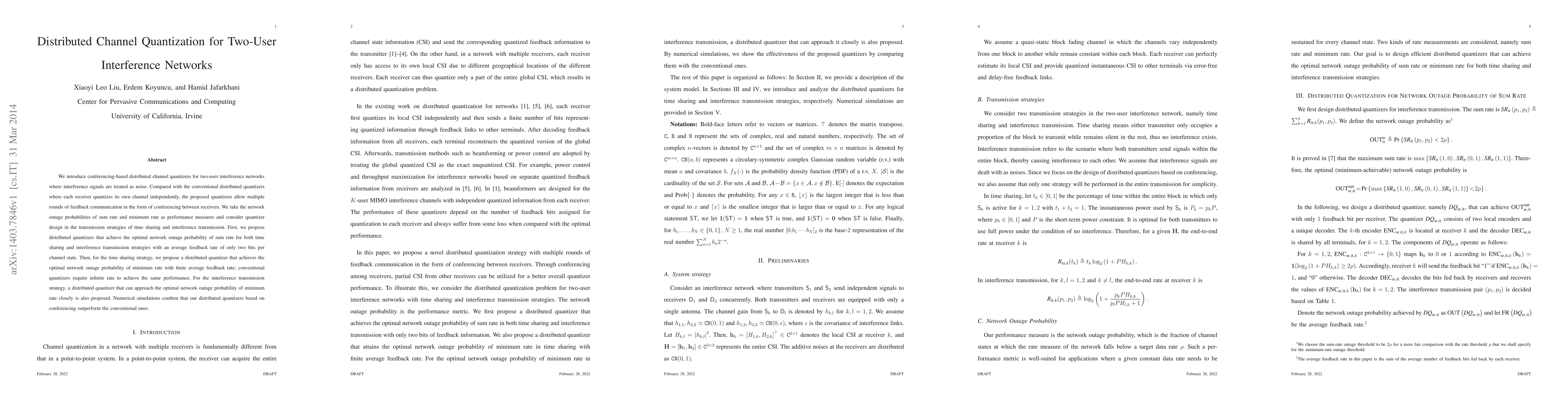 This paper proposes conferencing-based distributed channel quantizers for two-user interference networks, allowing multiple feedback rounds between receivers to improve performance. The new quantizers outperform conventional ones by achieving optimal network outage probabilities with significantly lower feedback rates.