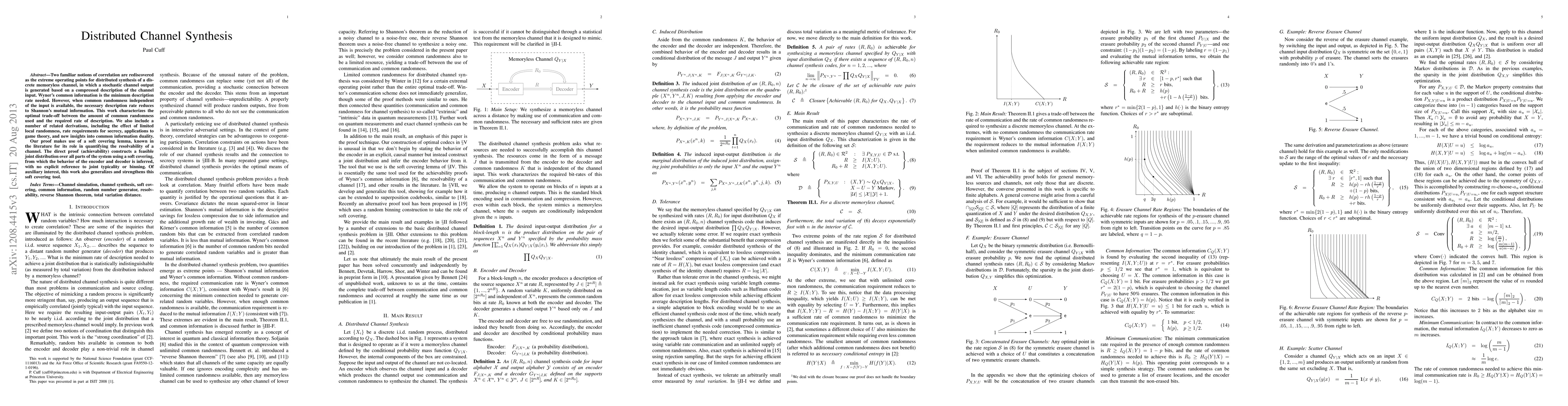 Two familiar notions of correlation are rediscovered as the extreme operating points for distributed synthesis of a discrete memoryless channel, in which a stochastic channel output is generated based on a compressed description of the channel input. Wyner's common information is the minimum description rate needed. However, when common randomness independent of the input is available, the necessary description rate reduces to Shannon's mutual information. This work characterizes the optimal trade-off between the amount of common randomness used and the required rate of description. We also include a number of related derivations, including the effect of limited local randomness, rate requirements for secrecy, applications to game theory, and new insights into common information duality. Our proof makes use of a soft covering lemma, known in the literature for its role in quantifying the resolvability of a channel. The direct proof (achievability) constructs a feasible joint distribution over all parts of the system using a soft covering, from which the behavior of the encoder and decoder is inferred, with no explicit reference to joint typicality or binning. Of auxiliary interest, this work also generalizes and strengthens this soft covering tool.