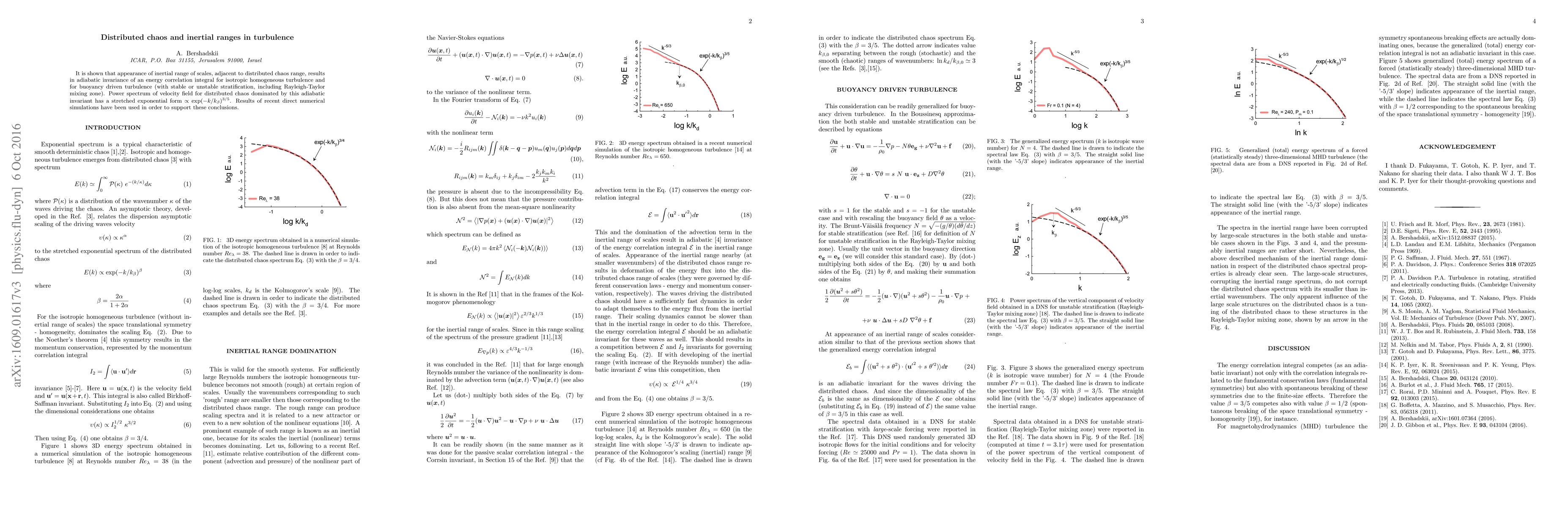 It is shown that appearance of inertial range of scales, adjacent to distributed chaos range, results in adiabatic invariance of an energy correlation integral for isotropic homogeneous turbulence and for buoyancy driven turbulence (with stable or unstable stratification, including Rayleigh-Taylor mixing zone). Power spectrum of velocity field for distributed chaos dominated by this adiabatic invariant has a stretched exponential form $\propto \exp(-k/k_{\beta})^{3/5}$. Results of recent direct numerical simulations have been used in order to support these conclusions.