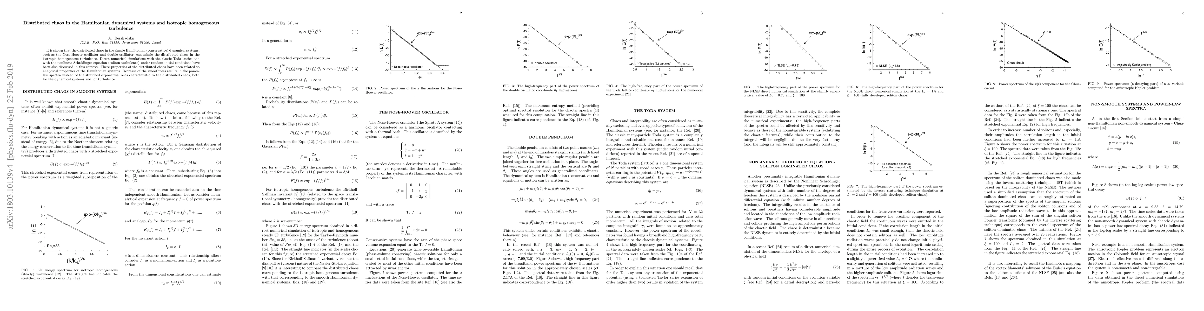 This paper explores how distributed chaos in simple Hamiltonian dynamical systems like the Nose-Hoover oscillator and double oscillator mirrors the behavior seen in isotropic homogeneous turbulence. The study uses numerical simulations of the Toda lattice and nonlinear Schrödinger equation to illustrate these chaotic properties, linking the analytical characteristics of Hamiltonian systems to turbulence dynamics.
