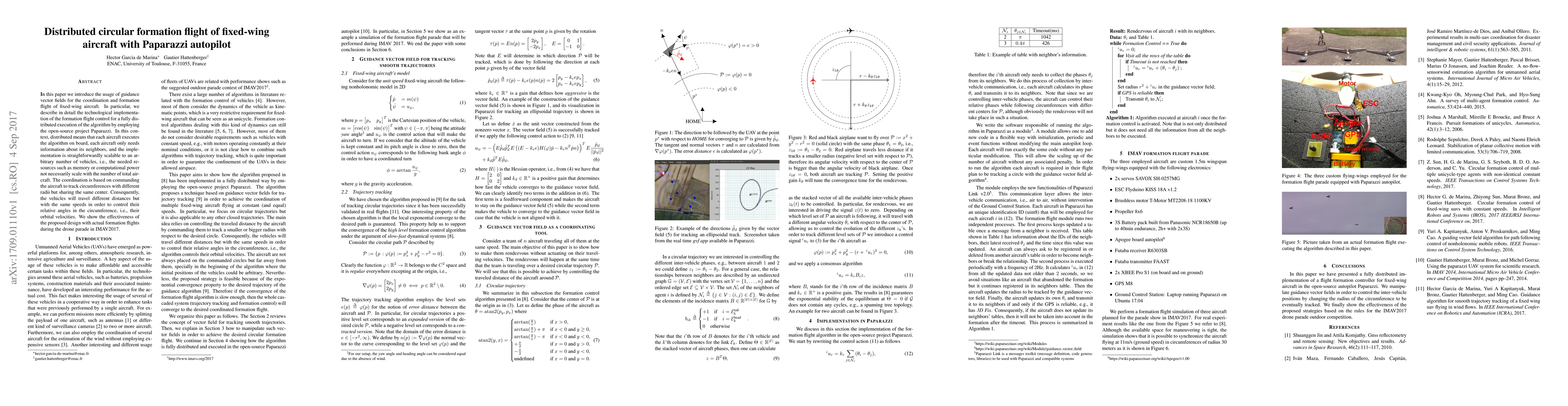 In this paper we introduce the usage of guidance vector fields for the coordination and formation flight of fixed-wing aircraft. In particular, we describe in detail the technological implementation of the formation flight control for a fully distributed execution of the algorithm by employing the open-source project Paparazzi. In this context, distributed means that each aircraft executes the algorithm on board, each aircraft only needs information about its neighbors, and the implementation is straightforwardly scalable to an arbitrary number of vehicles, i.e., the needed resources such as memory or computational power not necessarily scale with the number of total aircraft. The coordination is based on commanding the aircraft to track circumferences with different radii but sharing the same center. Consequently, the vehicles will travel different distances but with the same speeds in order to control their relative angles in the circumference, i.e., their orbital velocities. We show the effectiveness of the proposed design with actual formation flights during the drone parade in IMAV2017.