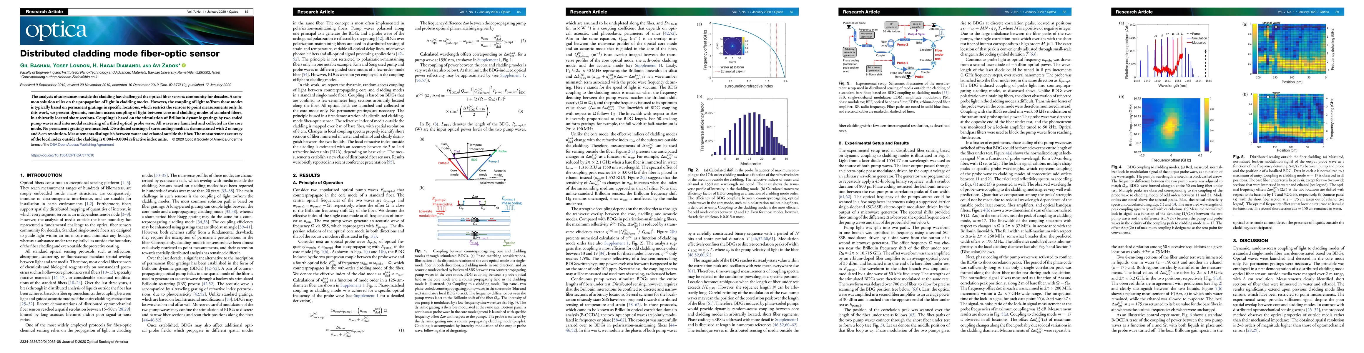 This paper presents a novel distributed cladding mode fiber-optic sensor that enables dynamic, random-access coupling of light between core and cladding modes without permanent gratings, achieving distributed sensing with 2 m range and 8 cm resolution. The method uses Brillouin dynamic gratings and intermodal scattering, demonstrating accurate measurement of the local index of substances outside the cladding.
