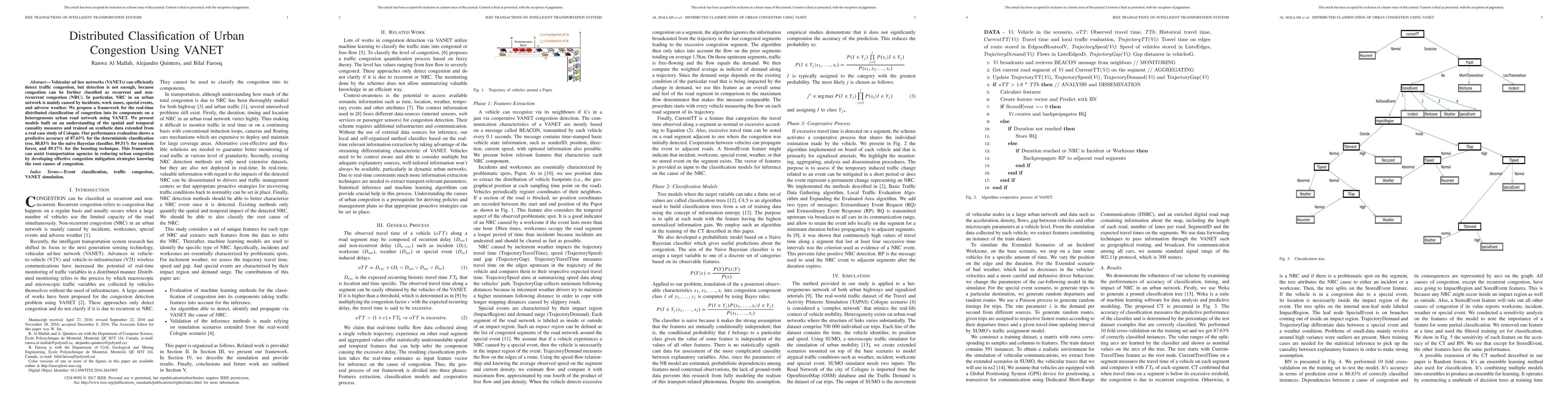 This paper proposes a distributed framework using VANET to classify urban congestion into recurrent and non-recurrent types, employing machine learning models for real-time analysis. The framework achieves high predictive accuracy, aiding transportation agencies in devising targeted congestion mitigation strategies.