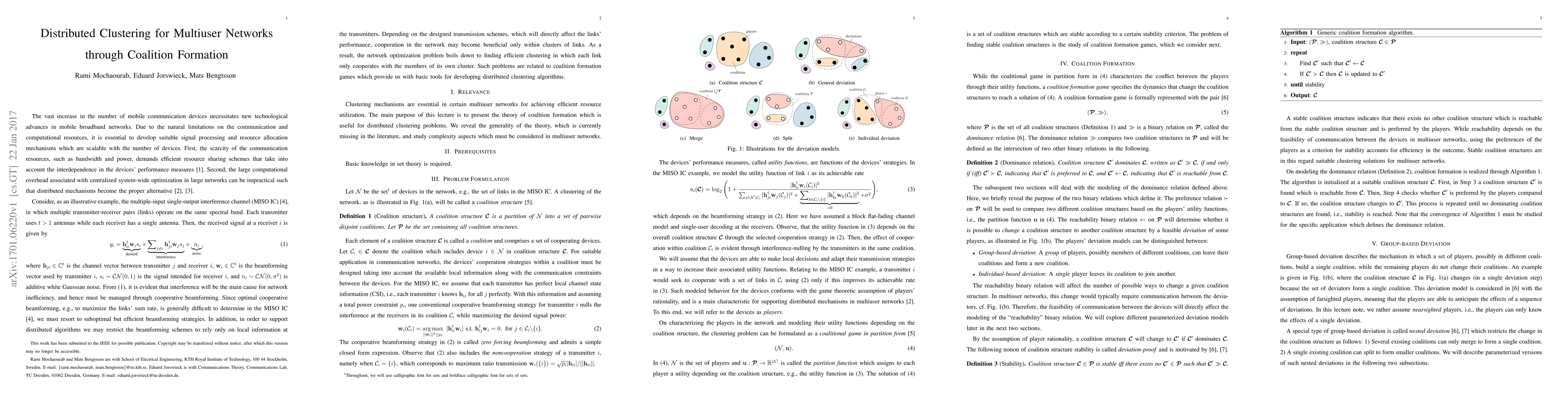 Clustering mechanisms are essential in certain multiuser networks for achieving efficient resource utilization. This lecture note presents the theory of coalition formation as a useful tool for distributed clustering problems. We reveal the generality of the theory, and study complexity aspects which must be considered in multiuser networks.