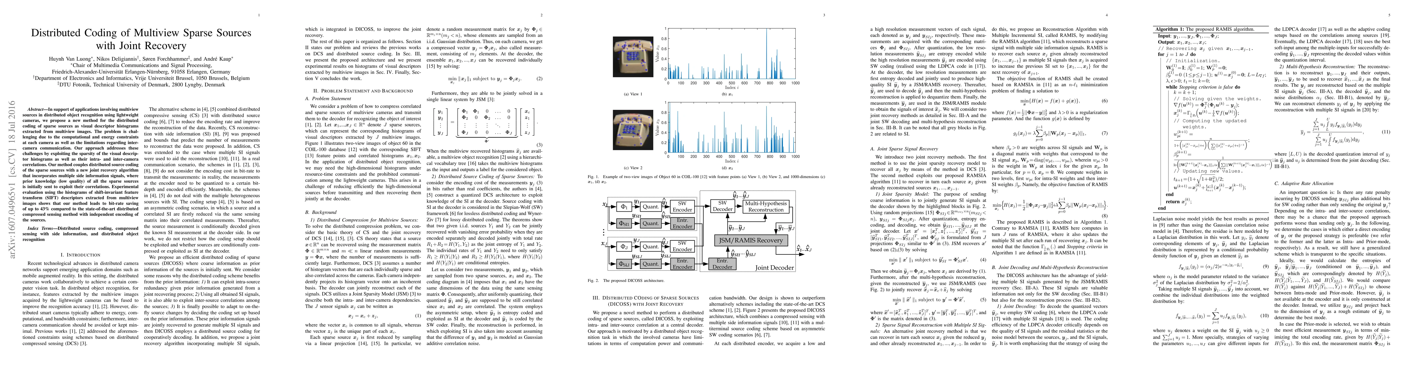 In support of applications involving multiview sources in distributed object recognition using lightweight cameras, we propose a new method for the distributed coding of sparse sources as visual descriptor histograms extracted from multiview images. The problem is challenging due to the computational and energy constraints at each camera as well as the limitations regarding inter-camera communication. Our approach addresses these challenges by exploiting the sparsity of the visual descriptor histograms as well as their intra- and inter-camera correlations. Our method couples distributed source coding of the sparse sources with a new joint recovery algorithm that incorporates multiple side information signals, where prior knowledge (low quality) of all the sparse sources is initially sent to exploit their correlations. Experimental evaluation using the histograms of shift-invariant feature transform (SIFT) descriptors extracted from multiview images shows that our method leads to bit-rate saving of up to 43% compared to the state-of-the-art distributed compressed sensing method with independent encoding of the sources.
