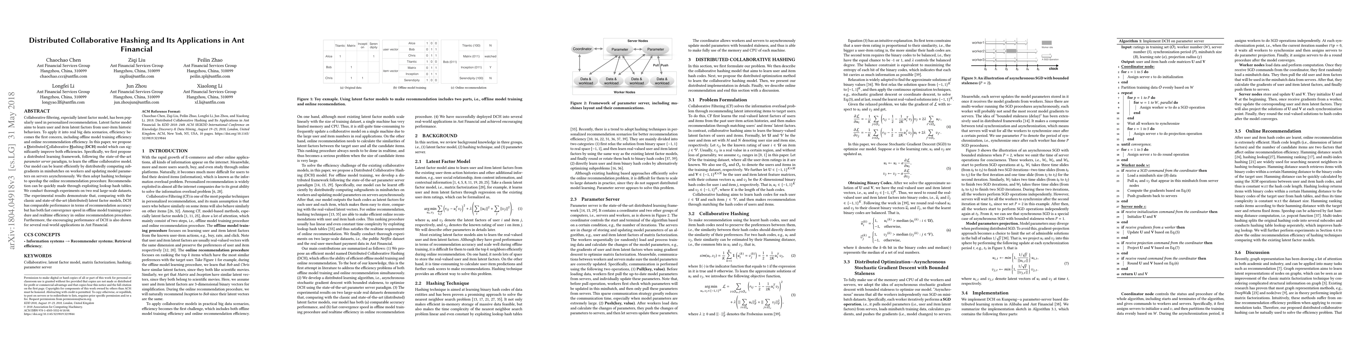 Collaborative filtering, especially latent factor model, has been popularly used in personalized recommendation. Latent factor model aims to learn user and item latent factors from user-item historic behaviors. To apply it into real big data scenarios, efficiency becomes the first concern, including offline model training efficiency and online recommendation efficiency. In this paper, we propose a Distributed Collaborative Hashing (DCH) model which can significantly improve both efficiencies. Specifically, we first propose a distributed learning framework, following the state-of-the-art parameter server paradigm, to learn the offline collaborative model. Our model can be learnt efficiently by distributedly computing subgradients in minibatches on workers and updating model parameters on servers asynchronously. We then adopt hashing technique to speedup the online recommendation procedure. Recommendation can be quickly made through exploiting lookup hash tables. We conduct thorough experiments on two real large-scale datasets. The experimental results demonstrate that, comparing with the classic and state-of-the-art (distributed) latent factor models, DCH has comparable performance in terms of recommendation accuracy but has both fast convergence speed in offline model training procedure and realtime efficiency in online recommendation procedure. Furthermore, the encouraging performance of DCH is also shown for several real-world applications in Ant Financial.