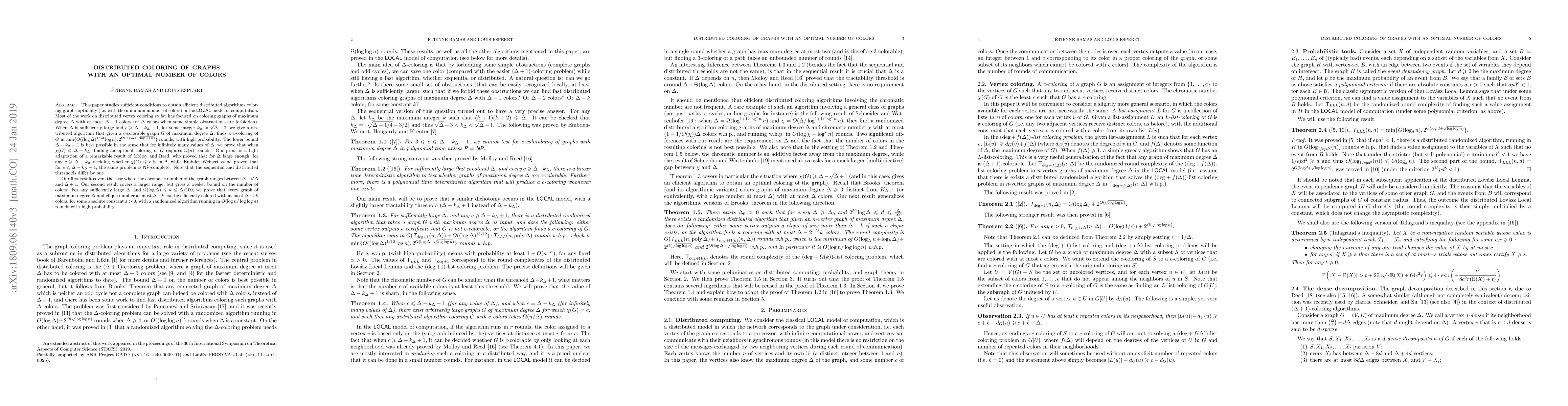 This paper studies sufficient conditions to obtain efficient distributed algorithms coloring graphs optimally (i.e.\ with the minimum number of colors) in the LOCAL model of computation. Most of the work on distributed vertex coloring so far has focused on coloring graphs of maximum degree $\Delta$ with at most $\Delta+1$ colors (or $\Delta$ colors when some simple obstructions are forbidden). When $\Delta$ is sufficiently large and $c\ge \Delta-k_\Delta+1$, for some integer $k_\Delta\approx \sqrt{\Delta}-2$, we give a distributed algorithm that given a $c$-colorable graph $G$ of maximum degree $\Delta$, finds a $c$-coloring of $G$ in $\min\{O((\log\Delta)^{1/12}\log n), 2^{O(\log \Delta+\sqrt{\log \log n})}\}$ rounds, with high probability. The lower bound $\Delta-k_\Delta+1$ is best possible in the sense that for infinitely many values of $\Delta$, we prove that when $\chi(G)\le \Delta -k_\Delta$, finding an optimal coloring of $G$ requires $\Omega(n)$ rounds. Our proof is a light adaptation of a remarkable result of Molloy and Reed, who proved that for $\Delta$ large enough, for any $c\ge \Delta - k_\Delta$ deciding whether $\chi(G)\le c$ is in {\textsf{P}}, while Embden-Weinert \emph{et al.}\ proved that for $c\le \Delta-k_\Delta-1$, the same problem is {\textsf{NP}}-complete. Note that the sequential and distributed thresholds differ by one. We also show that for any sufficiently large $\Delta$, and $\Omega(\log \Delta)\le k \le \Delta/100$, every graph of maximum degree $\Delta$ and clique number at most $\Delta-k$ can be efficiently colored with at most $\Delta-\varepsilon k$ colors, for some absolute constant $\varepsilon >0$, with a randomized algorithm running in $O(\log n/\log \log n)$ rounds with high probability.