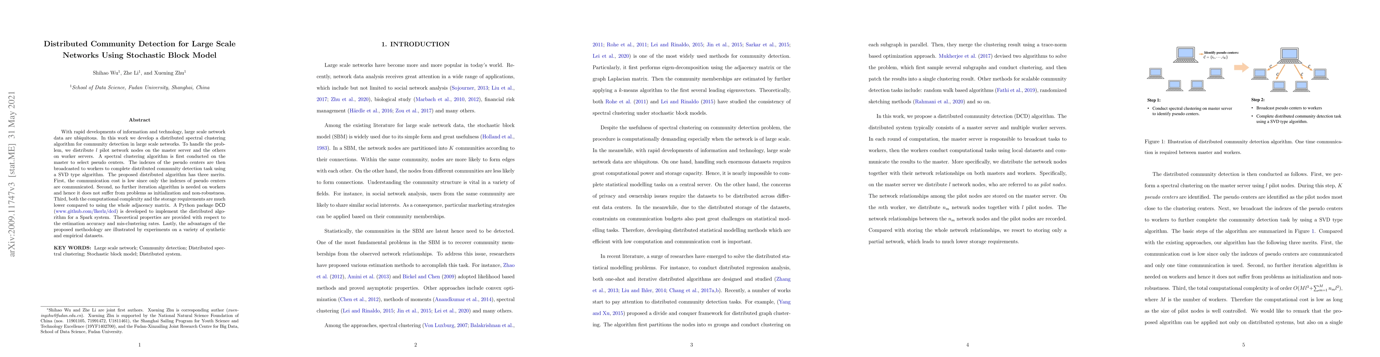 The paper develops a distributed spectral clustering algorithm for community detection in large-scale networks using the stochastic block model. It distributes pilot nodes on the master server and the rest on worker servers, employing a spectral clustering algorithm on the master to select pseudo centers, and then broadcasting their indexes to workers for distributed community detection using a SVD-type algorithm.