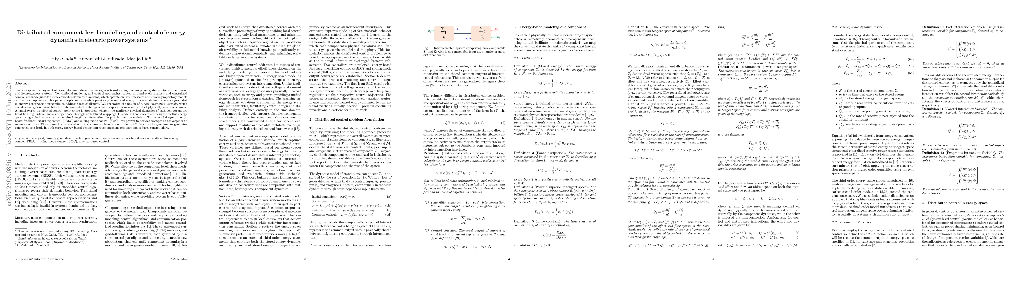 This paper introduces a distributed control framework for nonlinear energy dynamics in electric power systems, improving transient response and reducing control effort.