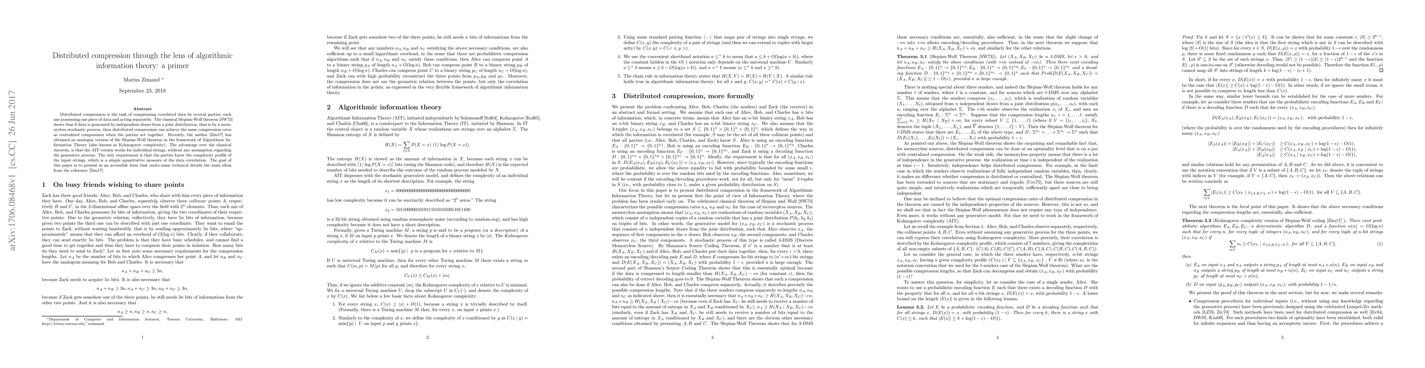 This paper provides an accessible overview of distributed compression through the lens of Algorithmic Information Theory, demonstrating how it can achieve the same compression rates as centralized compression without assuming independent data generation, only requiring knowledge of the complexity profile of the input strings. It simplifies the original results from M. Zimand (STOC 2017) for broader understanding.