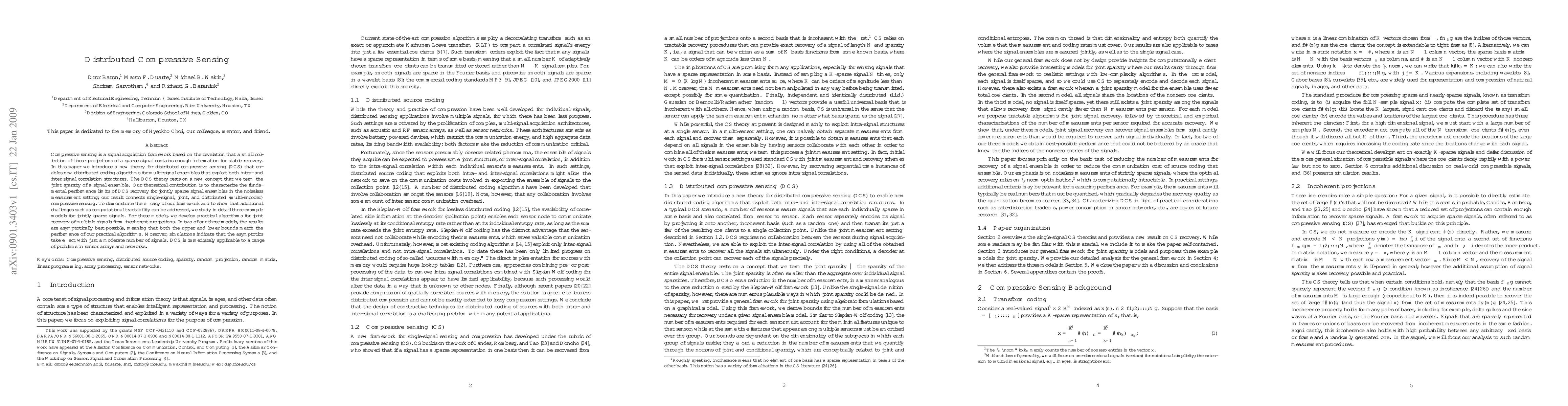 This paper introduces a new theory for distributed compressive sensing (DCS) that leverages joint sparsity of signal ensembles to enable efficient distributed coding algorithms. The authors demonstrate the theoretical performance limits of DCS recovery and show practical algorithms that achieve near-optimal results for jointly sparse signals, applicable to sensor arrays and networks.
