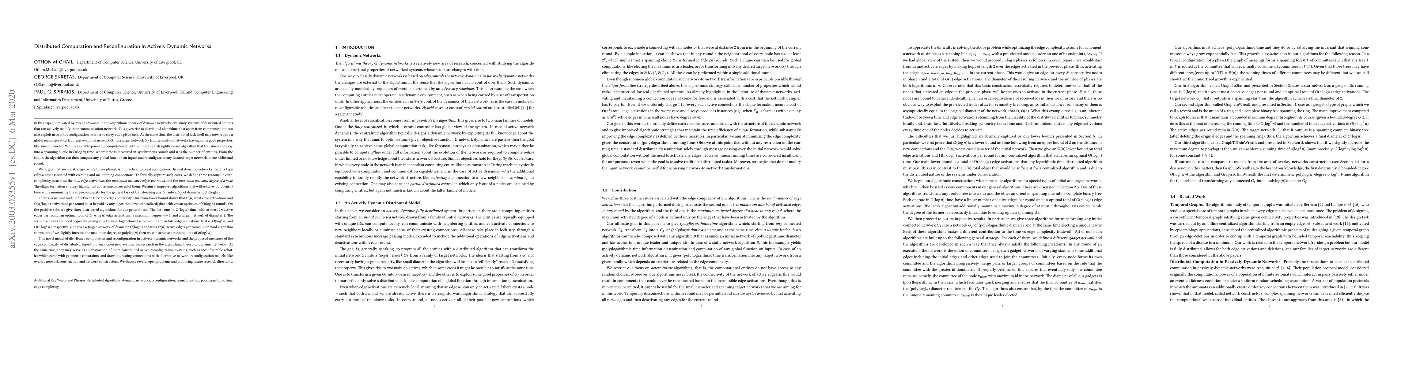 In this paper, we study systems of distributed entities that can actively modify their communication network. This gives rise to distributed algorithms that apart from communication can also exploit network reconfiguration in order to carry out a given task. At the same time, the distributed task itself may now require global reconfiguration from a given initial network $G_s$ to a target network $G_f$ from a family of networks having some good properties, like small diameter. With reasonably powerful computational entities, there is a straightforward algorithm that transforms any $G_s$ into a spanning clique in $O(\log n)$ time. The algorithm can then compute any global function on inputs and reconfigure to any target network in one round. We argue that such a strategy is impractical for real applications. In real dynamic networks there is a cost associated with creating and maintaining connections. To formally capture such costs, we define three edge-complexity measures: the \emph{total edge activations}, the \emph{maximum activated edges per round}, and the \emph{maximum activated degree of a node}. The clique formation strategy highlighted above, maximizes all of them. We aim at improved algorithms that achieve (poly)log$(n)$ time while minimizing the edge-complexity for the general task of transforming any $G_s$ into a $G_f$ of diameter (poly)log$(n)$. We give three distributed algorithms. The first runs in $O(\log n)$ time, with at most $2n$ active edges per round, an optimal total of $O(n\log n)$ edge activations, a maximum degree $n-1$, and a target network of diameter 2. The second achieves bounded degree by paying an additional logarithmic factor in time and in total edge activations and gives a target network of diameter $O(\log n)$. Our third algorithm shows that if we slightly increase the maximum degree to polylog$(n)$ then we can achieve a running time of $o(\log^2 n)$.