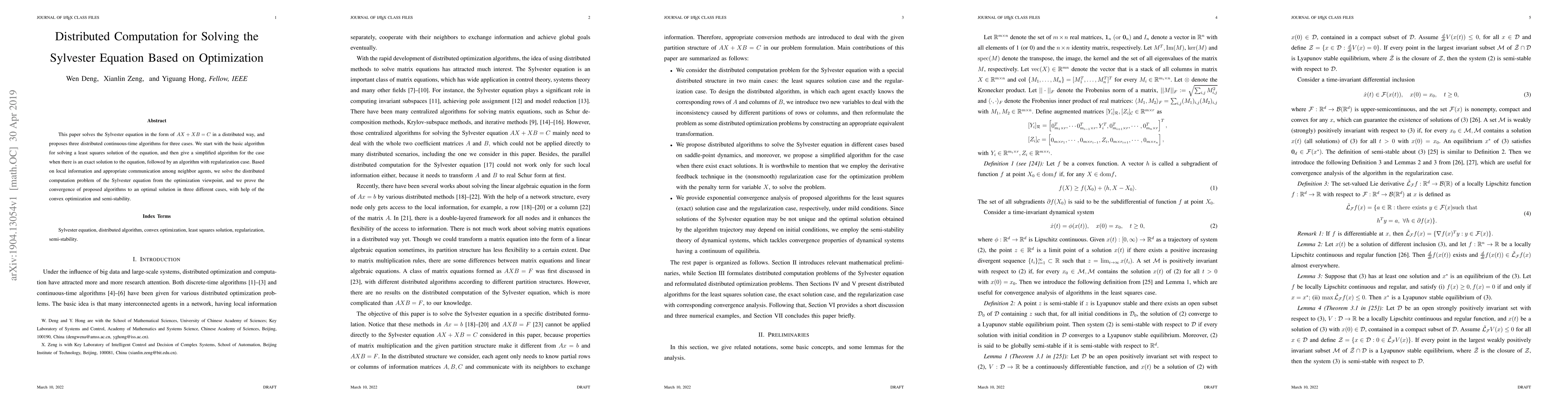This paper proposes three distributed continuous-time algorithms to solve the Sylvester equation AX + XB = C in different scenarios, leveraging local information and neighbor communication. It proves the convergence of these algorithms to an optimal solution using convex optimization and semi-stability.