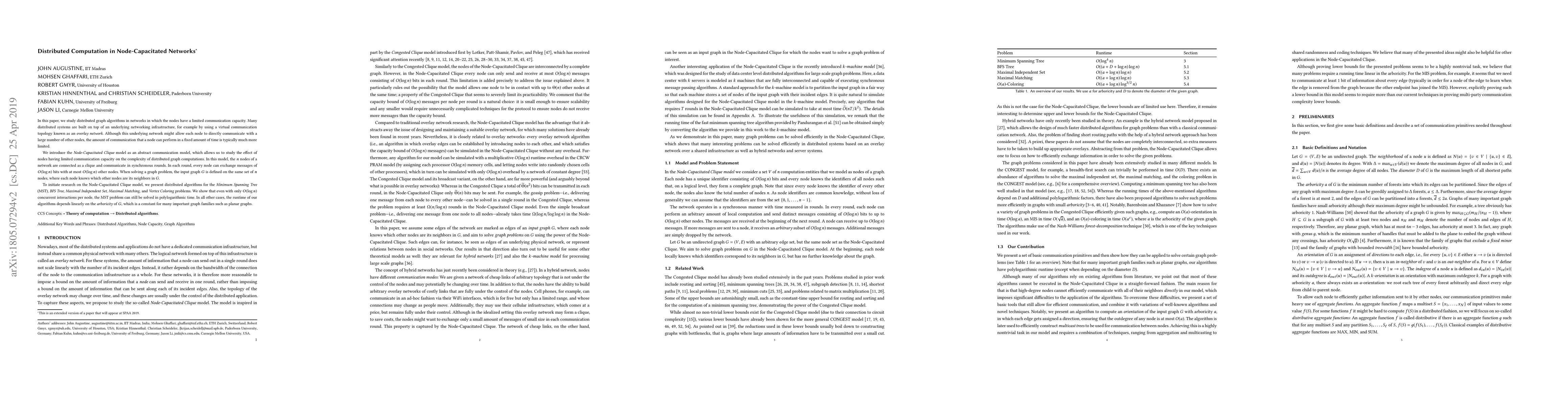 This paper introduces the Node-Capacitated Clique model to study distributed graph algorithms under node communication constraints. It presents algorithms for MST, BFS Tree, Maximal Independent Set, Maximal Matching, and Vertex Coloring in this model, showing that despite limited communication, polylogarithmic time solutions are feasible for some problems.