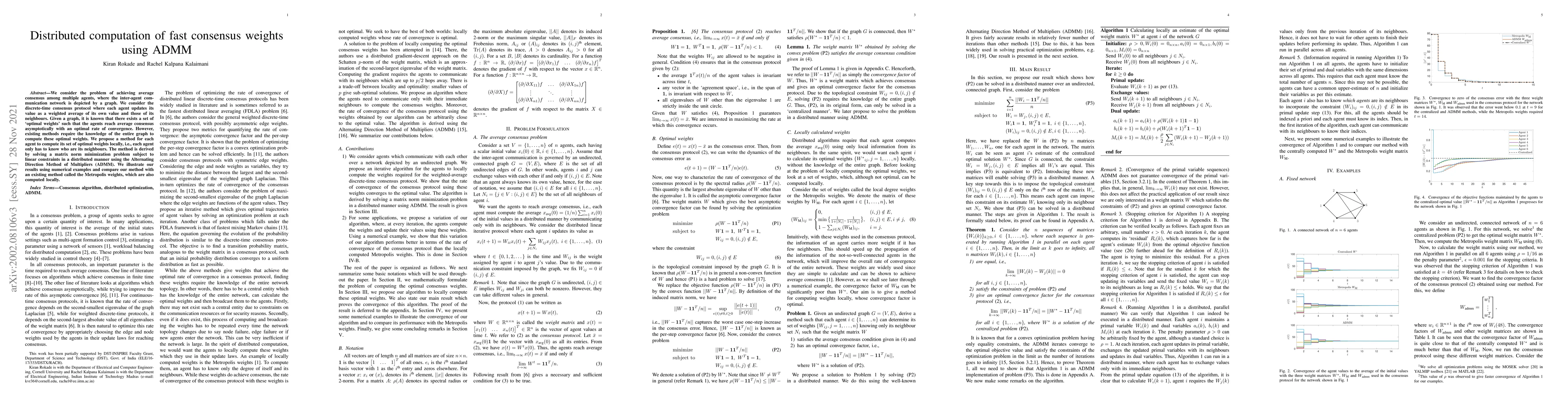This paper presents a method for agents in a network to locally compute optimal consensus weights using ADMM, eliminating the need for global graph knowledge. It's demonstrated through examples, offering an efficient alternative to existing local weight computation methods like Metropolis weights.