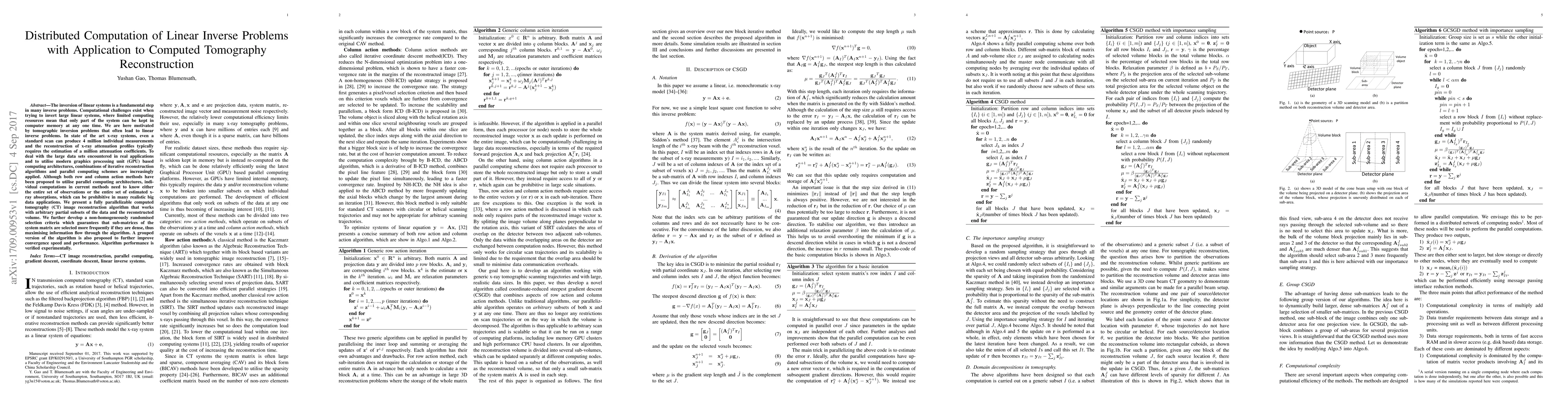 The inversion of linear systems is a fundamental step in many inverse problems. Computational challenges exist when trying to invert large linear systems, where limited computing resources mean that only part of the system can be kept in computer memory at any one time. We are here motivated by tomographic inversion problems that often lead to linear inverse problems. In state of the art x-ray systems, even a standard scan can produce 4 million individual measurements and the reconstruction of x-ray attenuation profiles typically requires the estimation of a million attenuation coefficients. To deal with the large data sets encountered in real applications and to utilise modern graphics processing unit (GPU) based computing architectures, combinations of iterative reconstruction algorithms and parallel computing schemes are increasingly applied. Although both row and column action methods have been proposed to utilise parallel computing architectures, individual computations in current methods need to know either the entire set of observations or the entire set of estimated x-ray absorptions, which can be prohibitive in many realistic big data applications. We present a fully parallelizable computed tomography (CT) image reconstruction algorithm that works with arbitrary partial subsets of the data and the reconstructed volume. We further develop a non-homogeneously randomised selection criteria which guarantees that sub-matrices of the system matrix are selected more frequently if they are dense, thus maximising information flow through the algorithm. A grouped version of the algorithm is also proposed to further improve convergence speed and performance. Algorithm performance is verified experimentally.