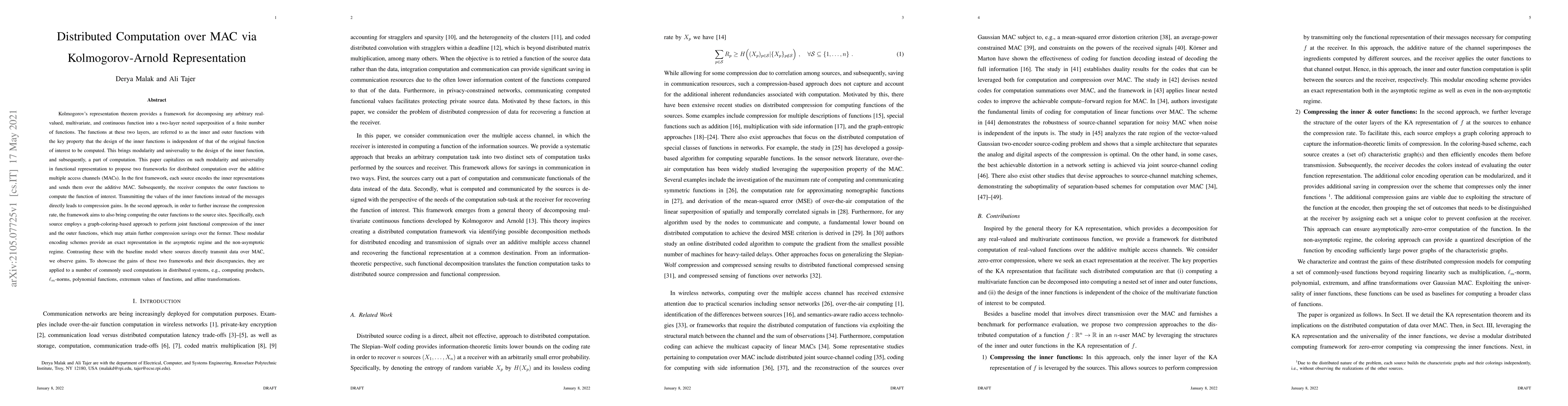 This paper proposes two frameworks for distributed computation over MAC channels using Kolmogorov-Arnold representation, achieving compression gains through modular encoding schemes.