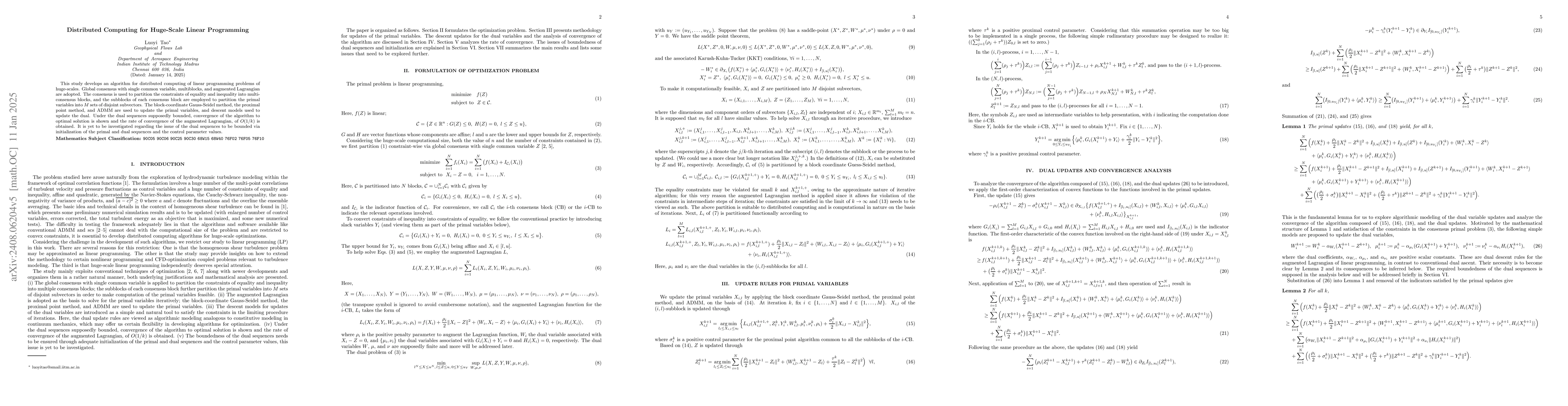 This study develops an algorithm for distributed computing of linear programming problems of huge-scales. Global consensus with single common variable, multiblocks, and augmented Lagrangian are adopted. The consensus is used to partition the constraints of equality and inequality into multi-consensus blocks, and the subblocks of each consensus block are employed to partition the primal variables into $M$ sets of disjoint subvectors. The block-coordinate Gauss-Seidel method, the proximal point method, and ADMM are used to update the primal variables, and descent models used to update the dual. Convergence of the algorithm to optimal solution is shown and the rate of convergence of the augmented Lagrangian, of $O(1/k)$ is obtained.