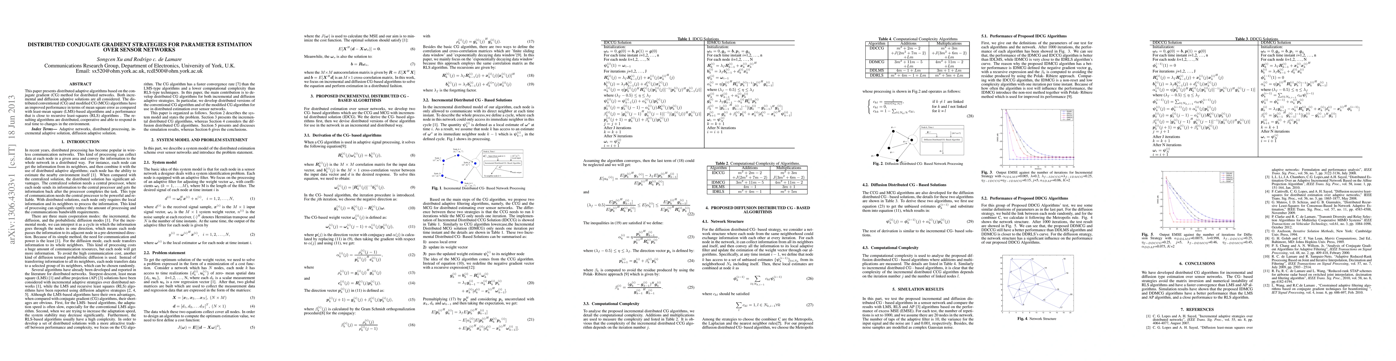 This paper introduces distributed adaptive algorithms based on the conjugate gradient method for sensor networks, showing improved mean square error performance compared to LMS-based algorithms and near-RLS performance. The proposed algorithms are distributed, cooperative, and capable of real-time adaptation to environmental changes.