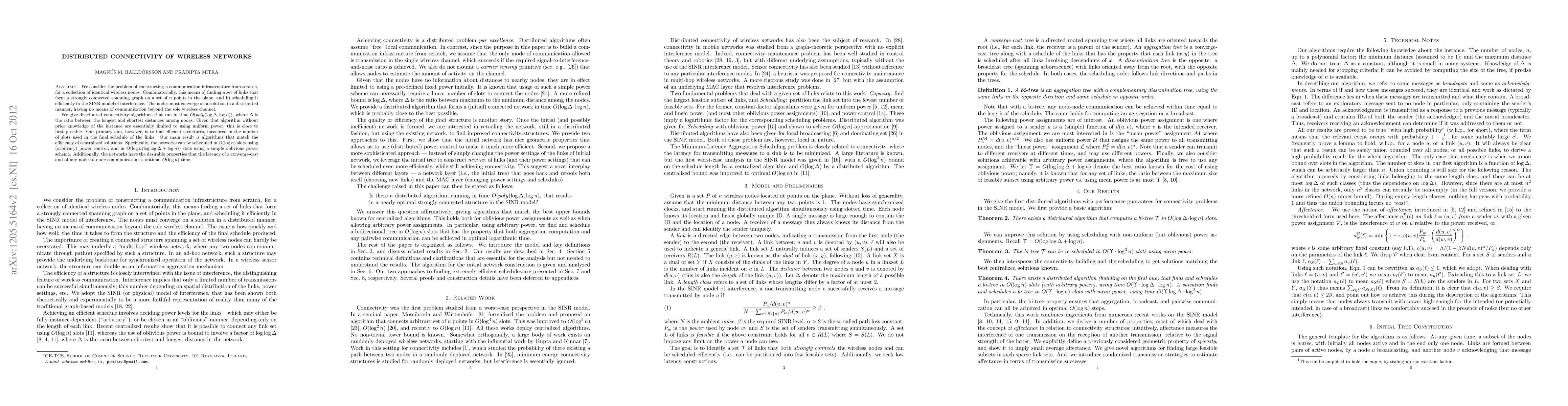 We consider the problem of constructing a communication infrastructure from scratch, for a collection of identical wireless nodes. Combinatorially, this means a) finding a set of links that form a strongly connected spanning graph on a set of $n$ points in the plane, and b) scheduling it efficiently in the SINR model of interference. The nodes must converge on a solution in a distributed manner, having no means of communication beyond the sole wireless channel. We give distributed connectivity algorithms that run in time $O(poly(\log \Delta, \log n))$, where $\Delta$ is the ratio between the longest and shortest distances among nodes. Given that algorithm without prior knowledge of the instance are essentially limited to using uniform power, this is close to best possible. Our primary aim, however, is to find efficient structures, measured in the number of slots used in the final schedule of the links. Our main result is algorithms that match the efficiency of centralized solutions. Specifically, the networks can be scheduled in $O(\log n)$ slots using (arbitrary) power control, and in $O(\log n (\log\log \Delta + \log n))$ slots using a simple oblivious power scheme. Additionally, the networks have the desirable properties that the latency of a converge-cast and of any node-to-node communication is optimal $O(\log n)$ time.