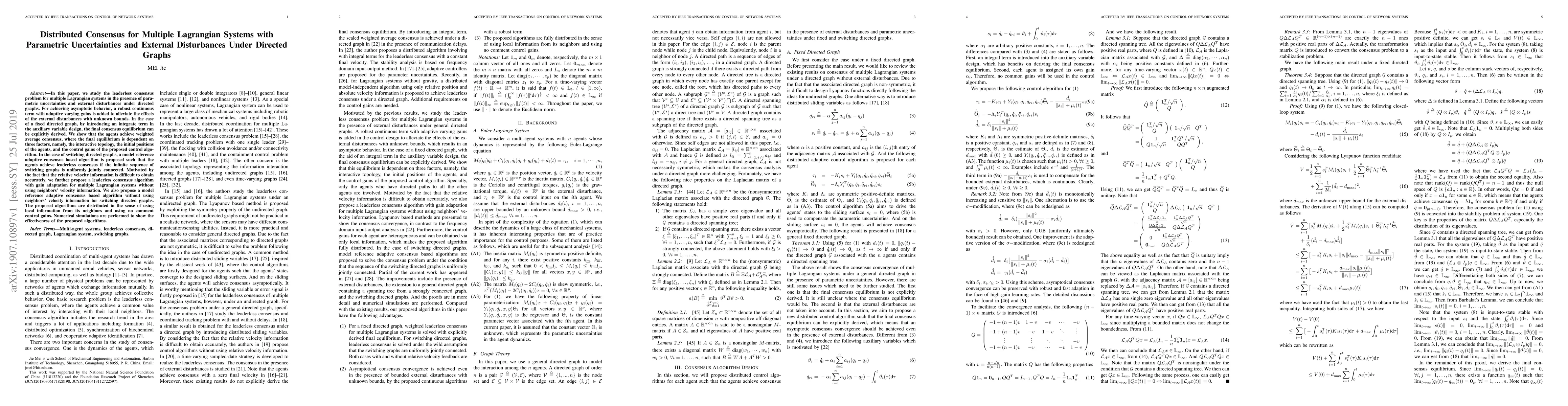 This paper addresses leaderless consensus for multiple Lagrangian systems under directed graphs, tackling parametric uncertainties and external disturbances. It proposes adaptive control algorithms to achieve consensus, with specific designs for fixed and switching directed graphs, and introduces distributed algorithms that do not require neighbors' velocity information. Numerical simulations validate the effectiveness of the proposed methods.