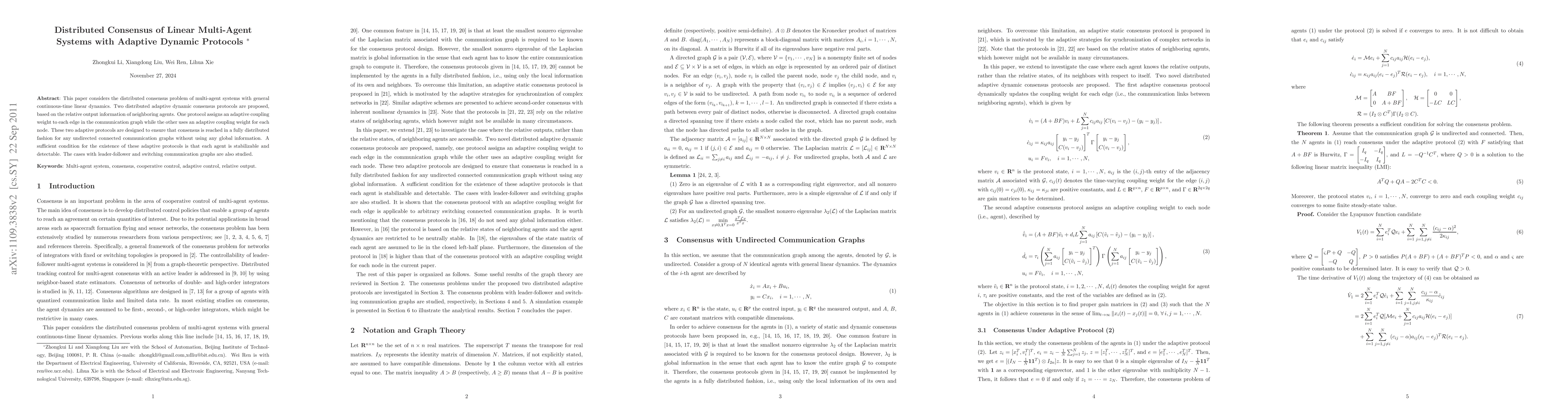 This paper proposes two adaptive dynamic consensus protocols for multi-agent systems with linear dynamics, ensuring distributed consensus without global information. The protocols adapt coupling weights based on relative output information, with conditions for stabilizability and detectability ensuring consensus in leader-follower and switching graph scenarios.