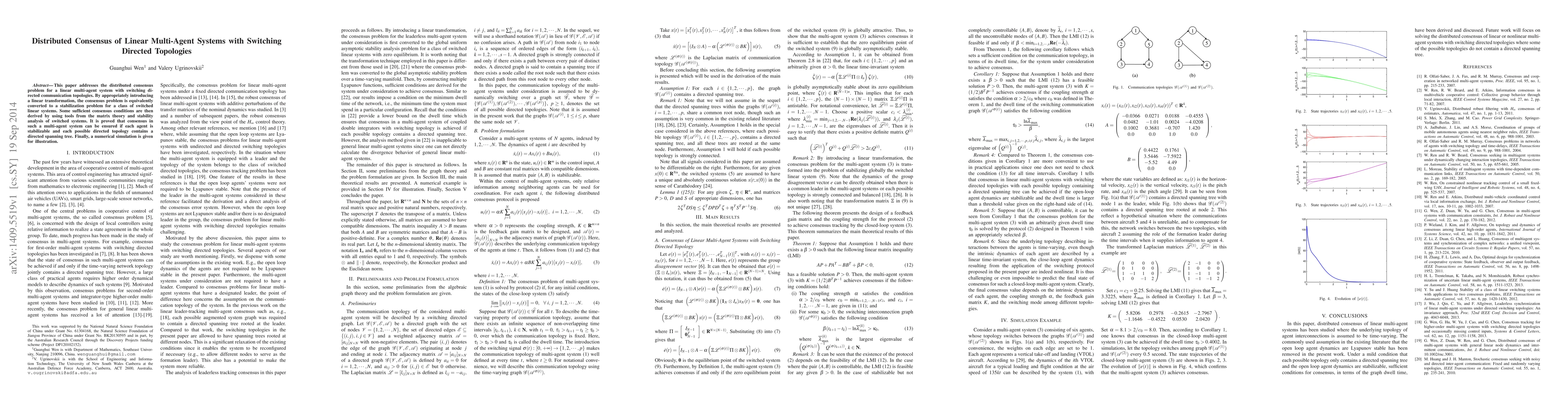 This paper tackles the distributed consensus problem for linear multi-agent systems with switching directed topologies, converting it into a stabilization problem for switched linear systems. It proves that consensus is achievable if each agent is stabilizable and each topology includes a directed spanning tree, supported by matrix theory and stability analysis.