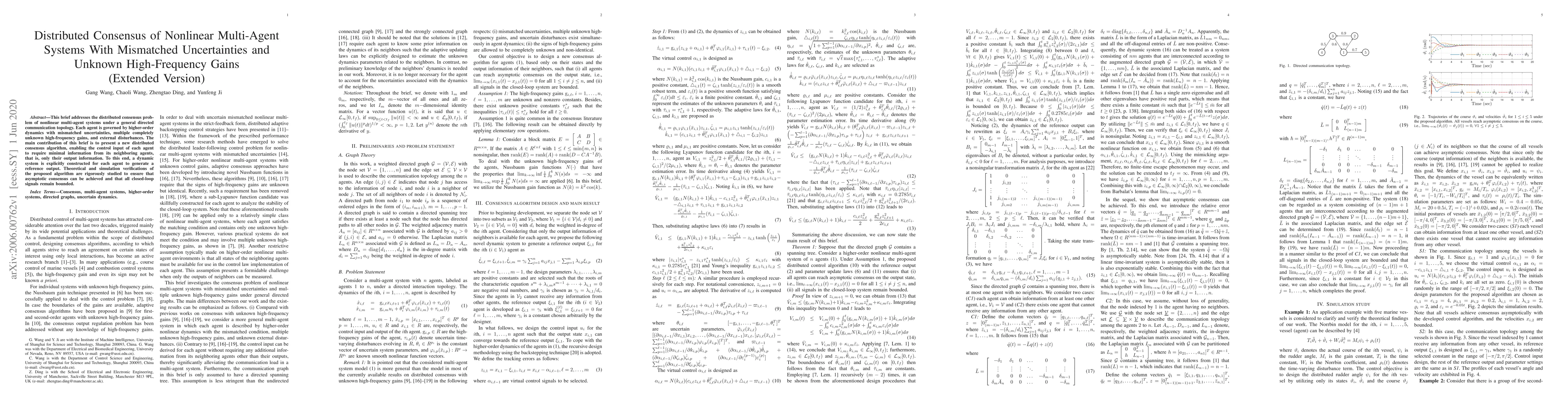 This paper presents a distributed consensus algorithm for nonlinear multi-agent systems with mismatched uncertainties and unknown high-frequency gains. The proposed algorithm requires minimal information from neighboring agents, achieving asymptotic consensus while ensuring bounded closed-loop signals.