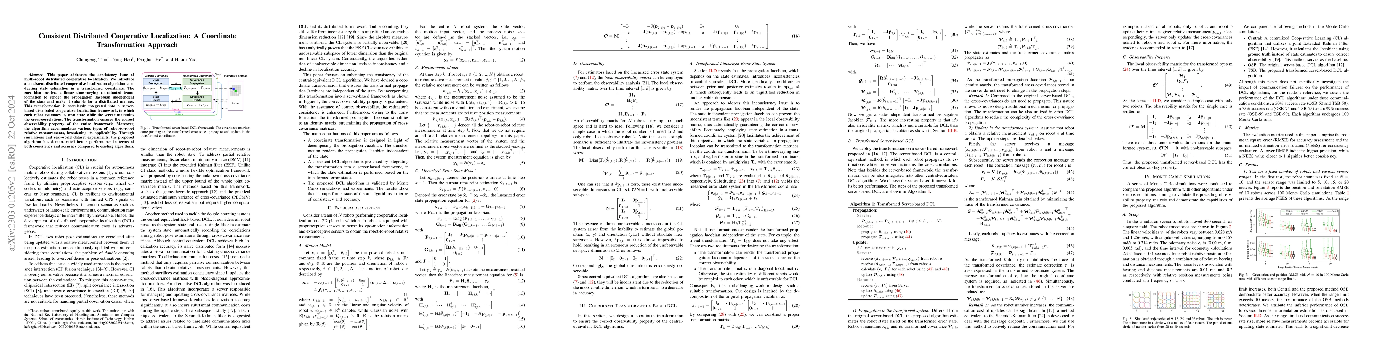 The paper proposes a distributed consistent multi-robot cooperative localization algorithm using a coordinate transformation approach. It employs EKF-based state estimation in a transformed coordinate system, ensuring correct observability properties and simplifying cross-covariance propagation.