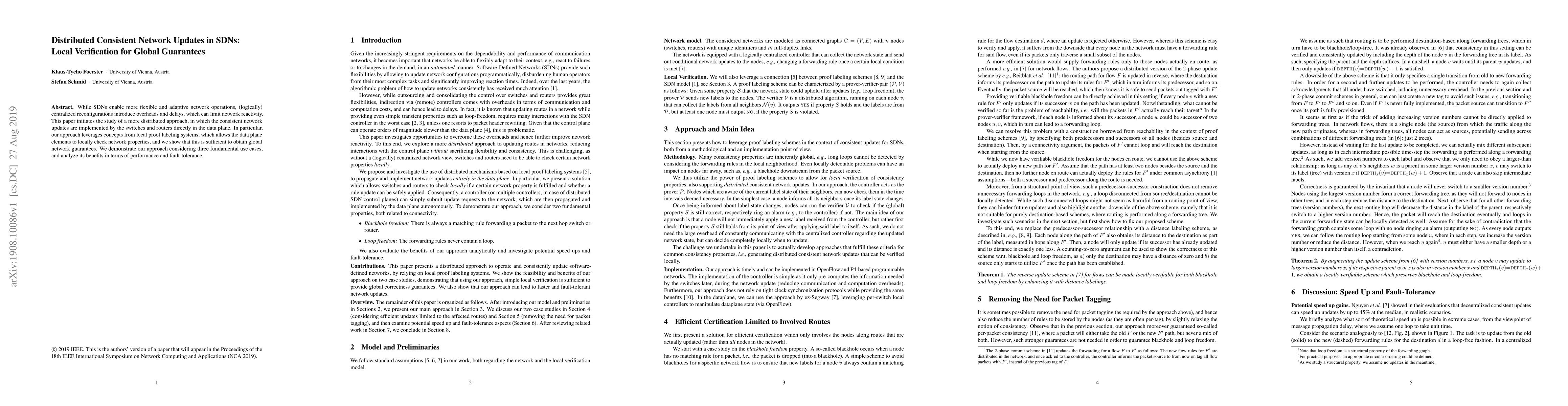 This paper proposes a distributed method for consistent network updates in Software-Defined Networks (SDNs) using local verification techniques. It leverages local proof labeling systems to enable data plane elements to check network properties, thereby achieving global network guarantees while enhancing performance and fault-tolerance.
