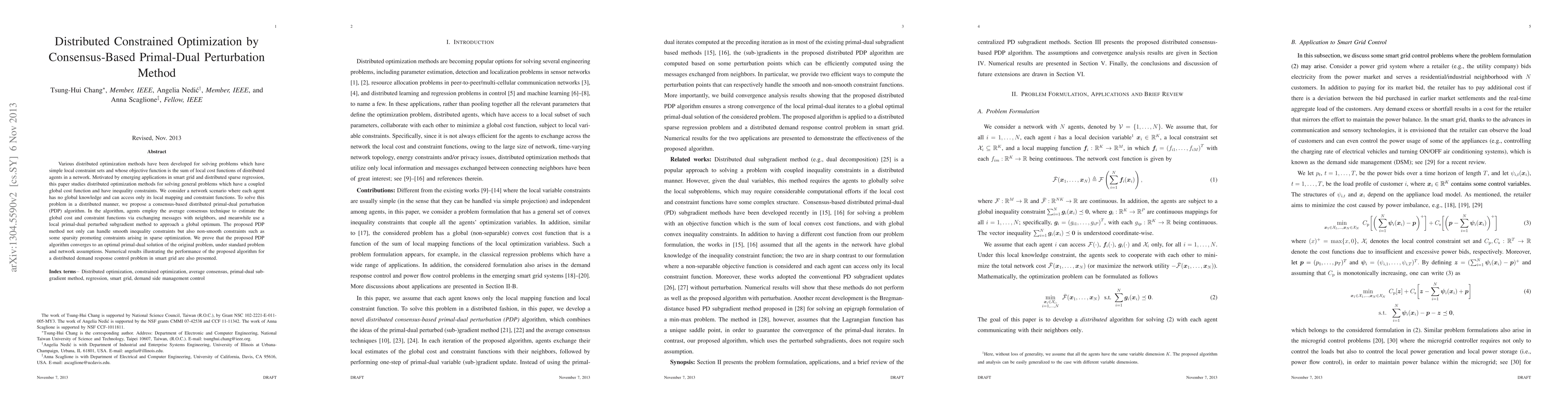 This paper proposes a consensus-based distributed primal-dual perturbation (PDP) algorithm for solving optimization problems with coupled global cost functions and inequality constraints in a network setting. The PDP algorithm converges to an optimal solution and handles both smooth and non-smooth constraints, demonstrated through a smart grid demand response control application.