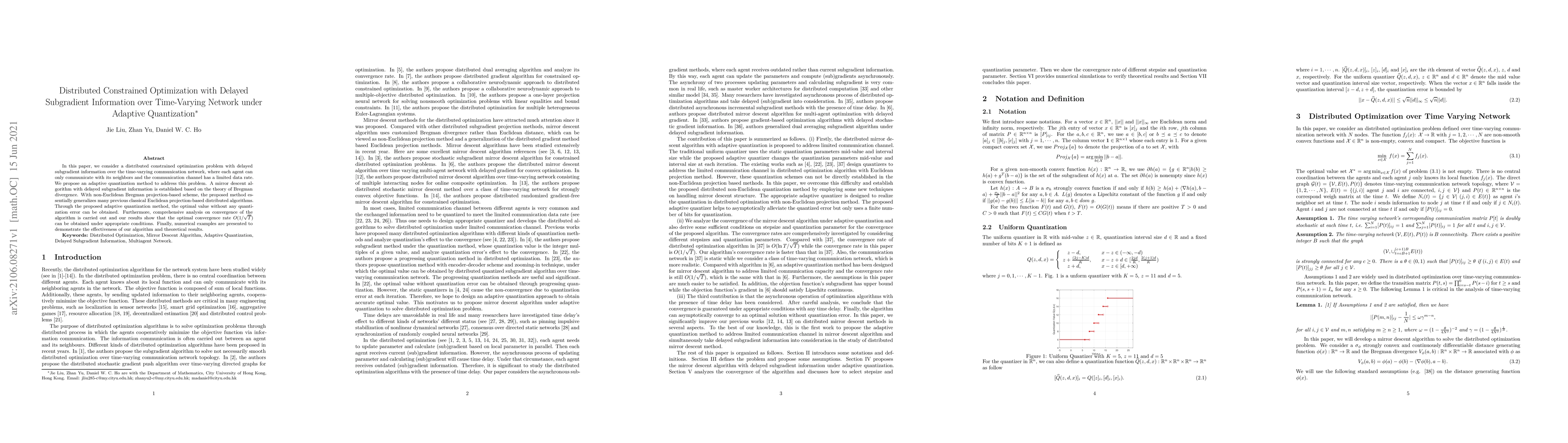 This paper proposes an adaptive quantization method for solving distributed constrained optimization problems over time-varying networks with delayed subgradient information. The method employs a mirror descent algorithm based on Bregman divergence, achieving optimal convergence rate $O(1/\sqrt{T})$ and demonstrating effectiveness through numerical examples.