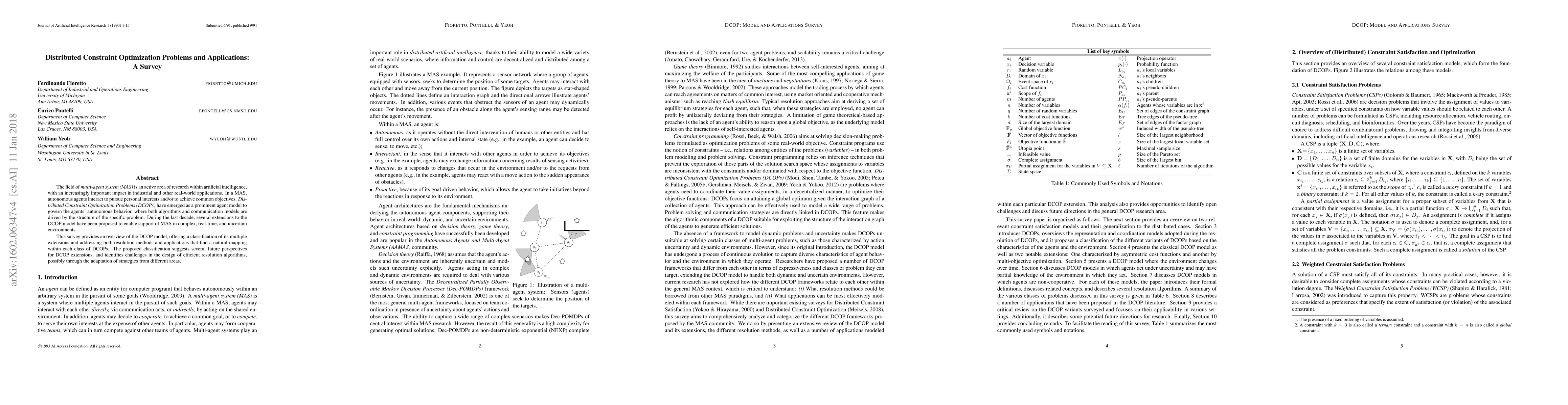 The field of Multi-Agent System (MAS) is an active area of research within Artificial Intelligence, with an increasingly important impact in industrial and other real-world applications. Within a MAS, autonomous agents interact to pursue personal interests and/or to achieve common objectives. Distributed Constraint Optimization Problems (DCOPs) have emerged as one of the prominent agent architectures to govern the agents' autonomous behavior, where both algorithms and communication models are driven by the structure of the specific problem. During the last decade, several extensions to the DCOP model have enabled them to support MAS in complex, real-time, and uncertain environments. This survey aims at providing an overview of the DCOP model, giving a classification of its multiple extensions and addressing both resolution methods and applications that find a natural mapping within each class of DCOPs. The proposed classification suggests several future perspectives for DCOP extensions, and identifies challenges in the design of efficient resolution algorithms, possibly through the adaptation of strategies from different areas.