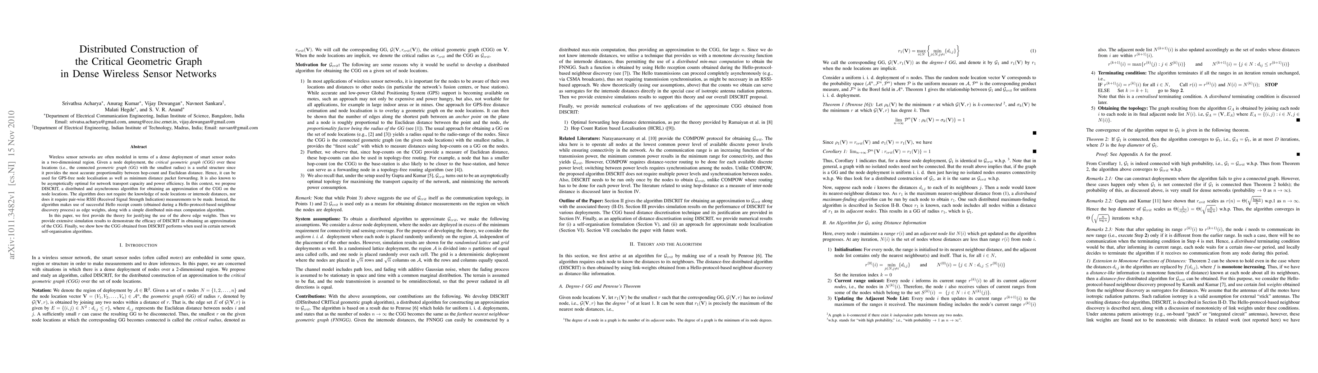 Wireless sensor networks are often modeled in terms of a dense deployment of smart sensor nodes in a two-dimensional region. Give a node deployment, the \emph{critical geometric graph (CGG)} over these locations (i.e., the connected \emph{geometric graph (GG)} with the smallest radius) is a useful structure since it provides the most accurate proportionality between hop-count and Euclidean distance. Hence, it can be used for GPS-free node localisation as well as minimum distance packet forwarding. It is also known to be asymptotically optimal for network transport capacity and power efficiency. In this context, we propose DISCRIT, a distributed and asynchronous algorithm for obtaining an approximation of the CGG on the node locations. The algorithm does not require the knowledge of node locations or internode distances, nor does it require pair-wise RSSI (Received Signal Strength Indication) measurements to be made. Instead, the algorithm makes use of successful Hello receipt counts (obtained during a Hello-protocol-based neighbour discovery process) as edge weights, along with a simple distributed min-max computation algorithm. In this paper, we first provide the theory for justifying the use of the above edge weights. Then we provide extensive simulation results to demonstrate the efficacy of DISCRIT in obtaining an approximation of the CGG. Finally, we show how the CGG obtained from DISCRIT performs when used in certain network self-organisation algorithms.