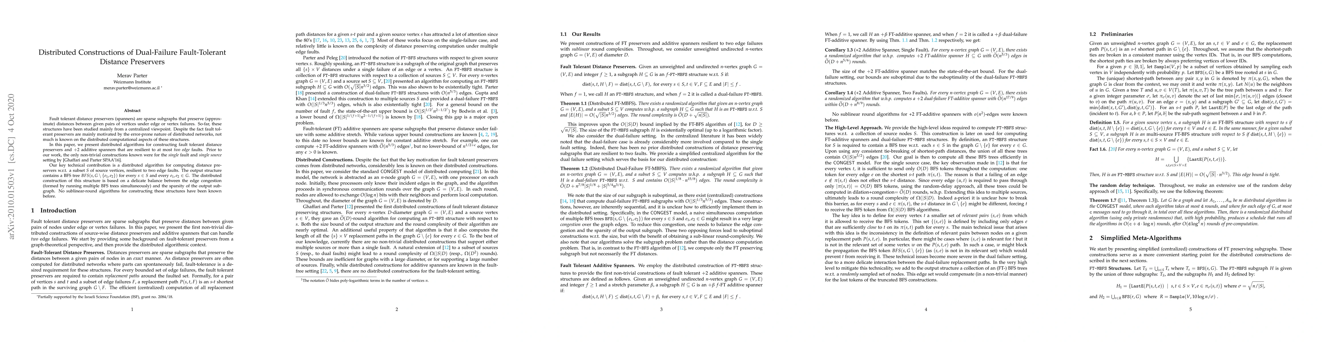 This paper presents distributed algorithms for constructing fault tolerant distance preservers resilient to two edge faults, addressing a gap in distributed computational aspects. The key contribution is a novel distributed algorithm for computing these preservers, balancing edge congestion and sparsity, and achieving sublinear-round constructions for the first time.
